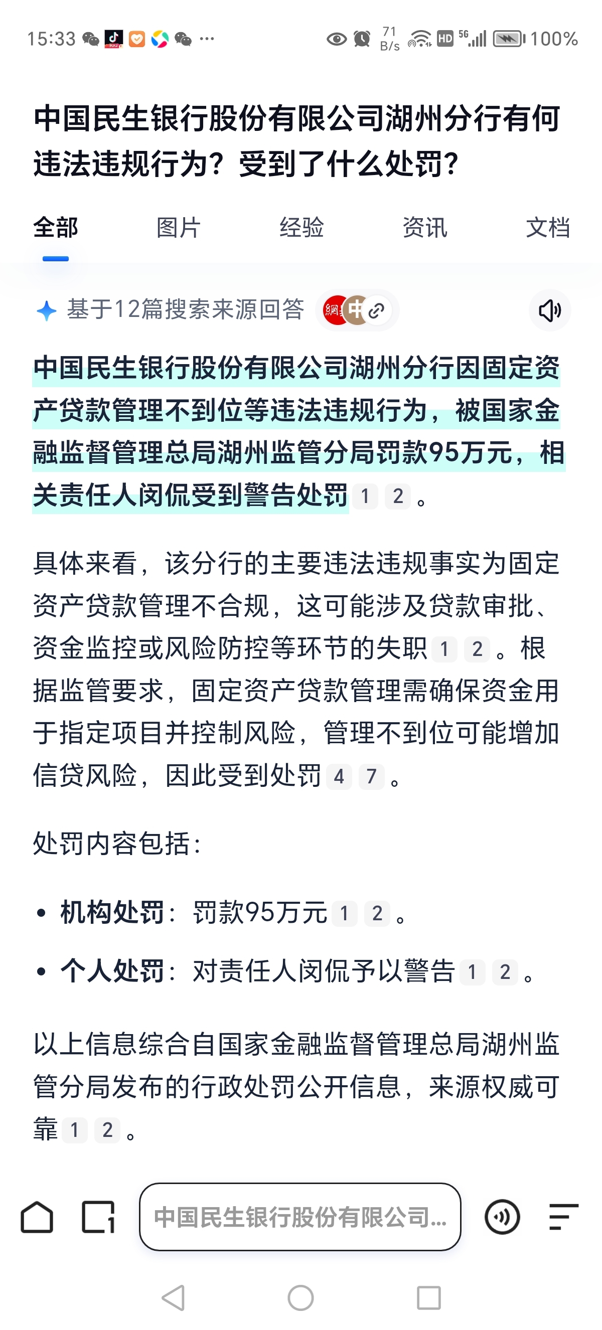 $民生银行(SH600016)$ 民生银行最新消息:中国民生银行股份有限公司湖州分行被国家金融监督管理总局湖州监管分局罚款95万元,责任人闵侃仅受到警告。
