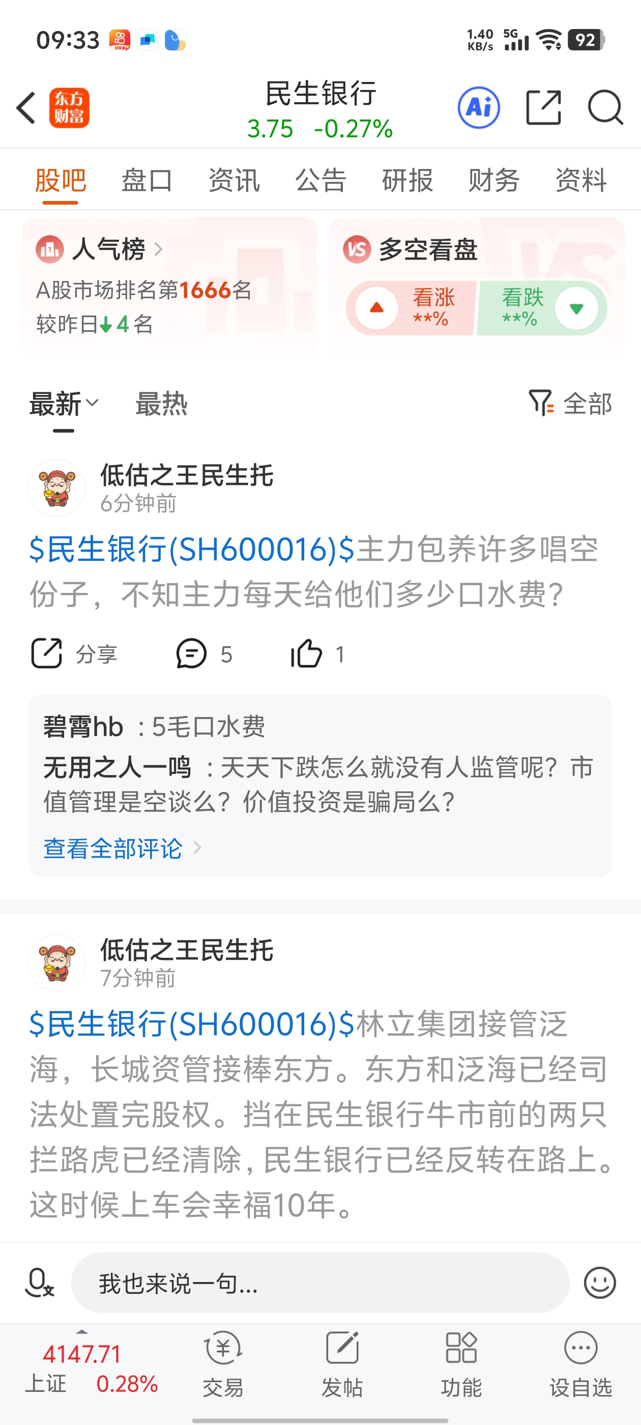 $民生银行(SH600016)$ 一天到晚呱呱呱的叫,一天不叫行不行?让民生银行涨一天?