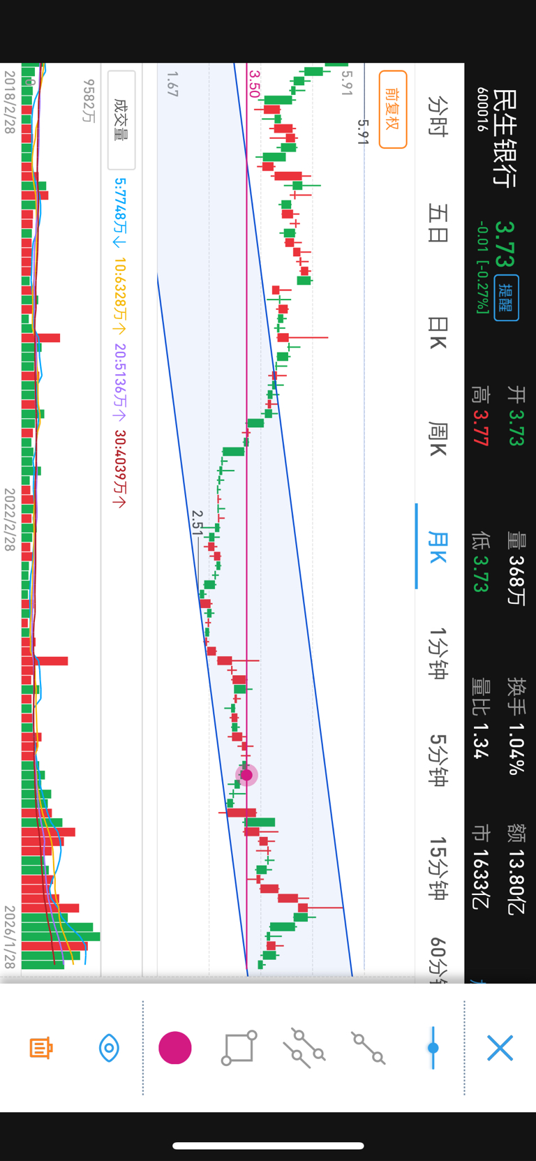 $民生银行(SH600016)$ 月线支撑位在3.5左右,