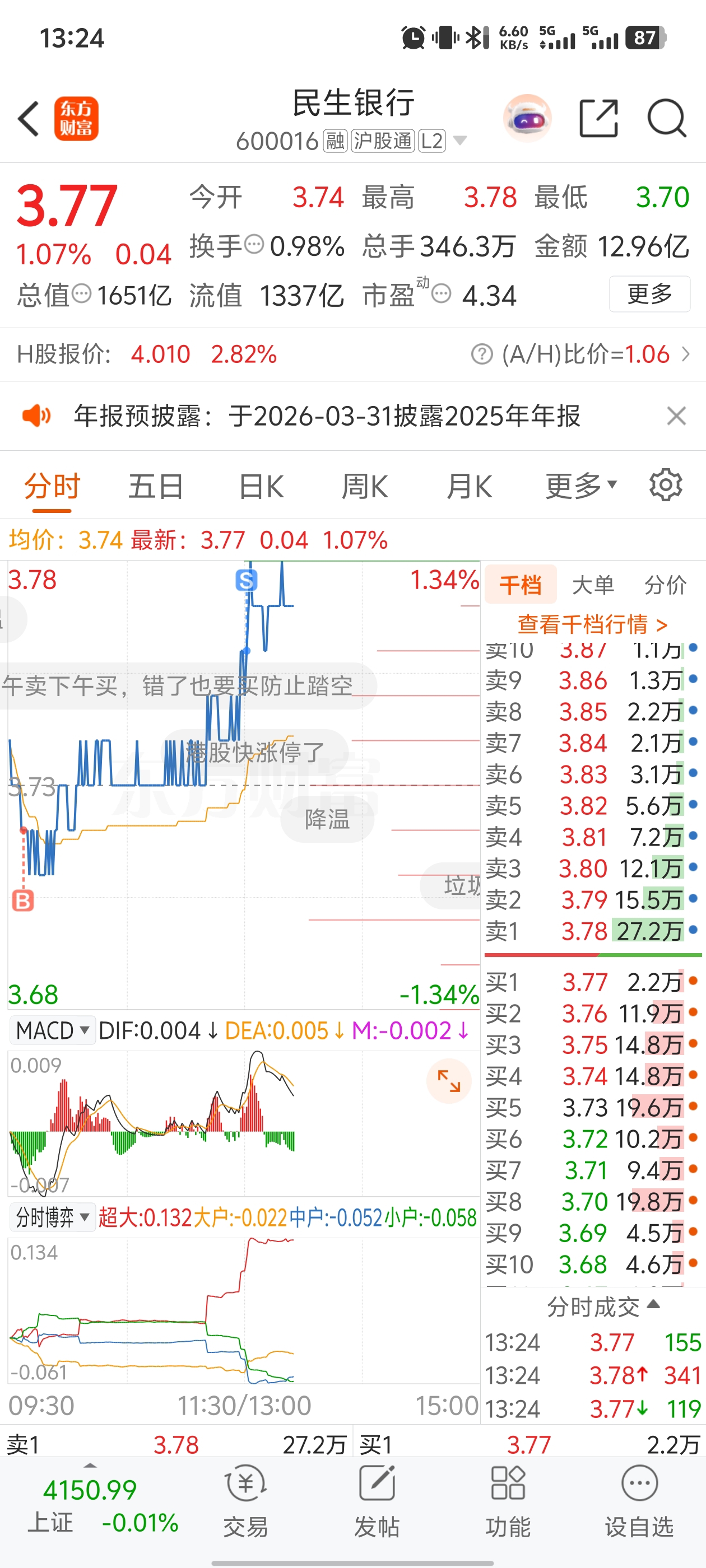 $民生银行(SH600016)$ 忘了撤单,吃个饭就被吃了今天加的仓