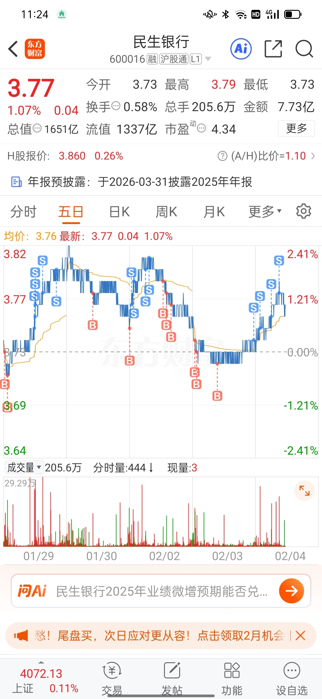 $民生银行(SH600016)$ 2分钱差价无限循环