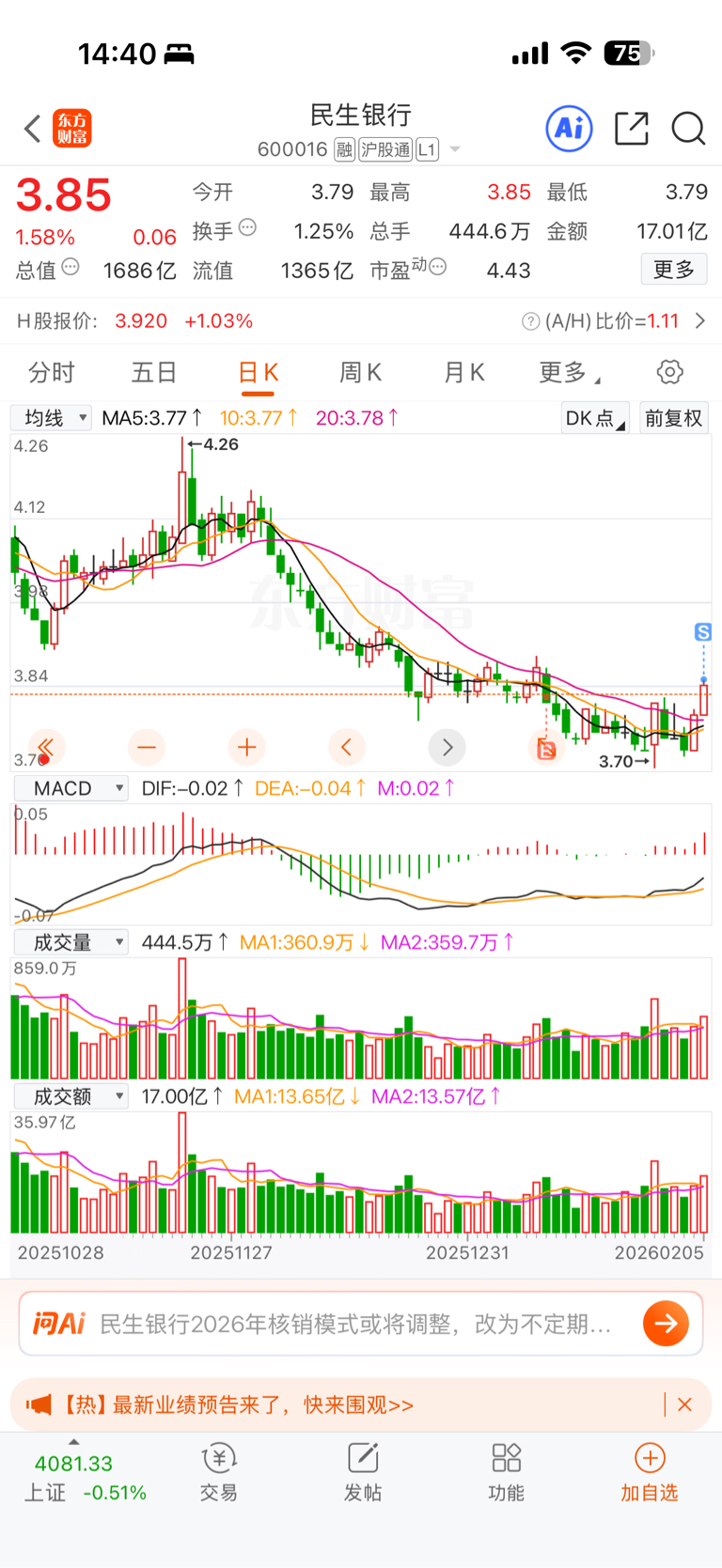 $民生银行(SH600016)$ 走了,祝各位发财