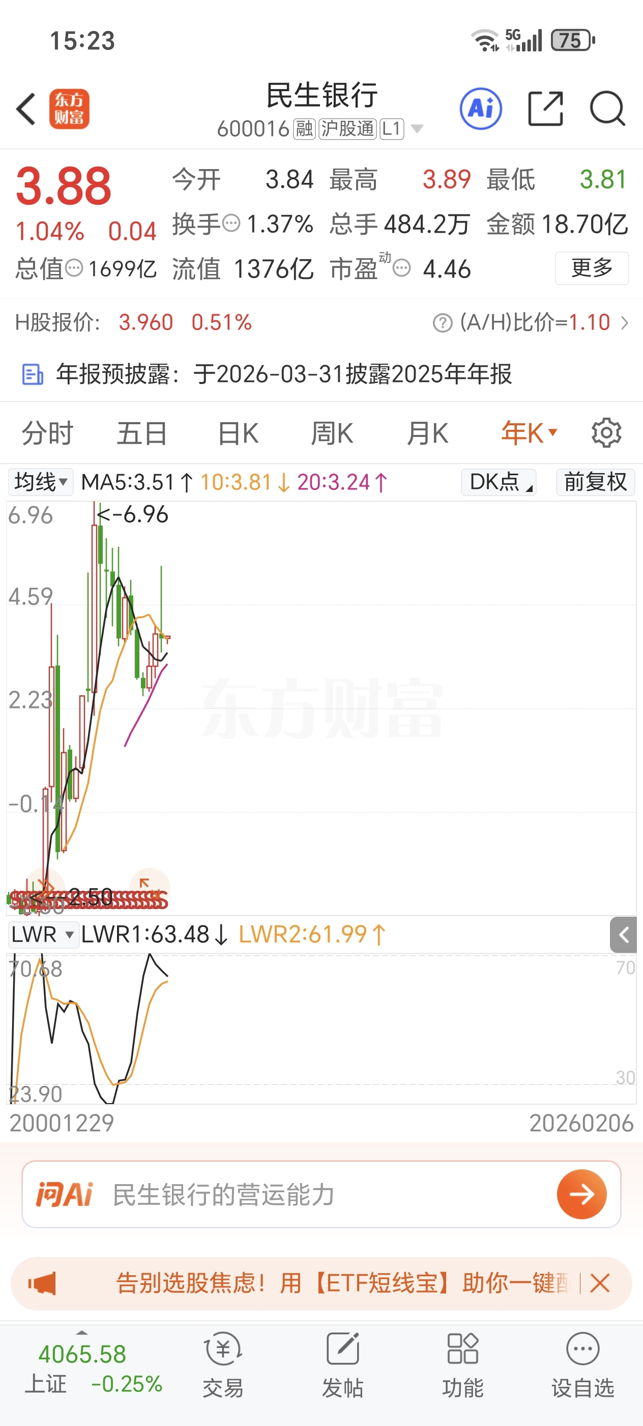 $民生银行(SH600016)$ 日线底部红三兵,年线即将金叉,开启翻倍之旅