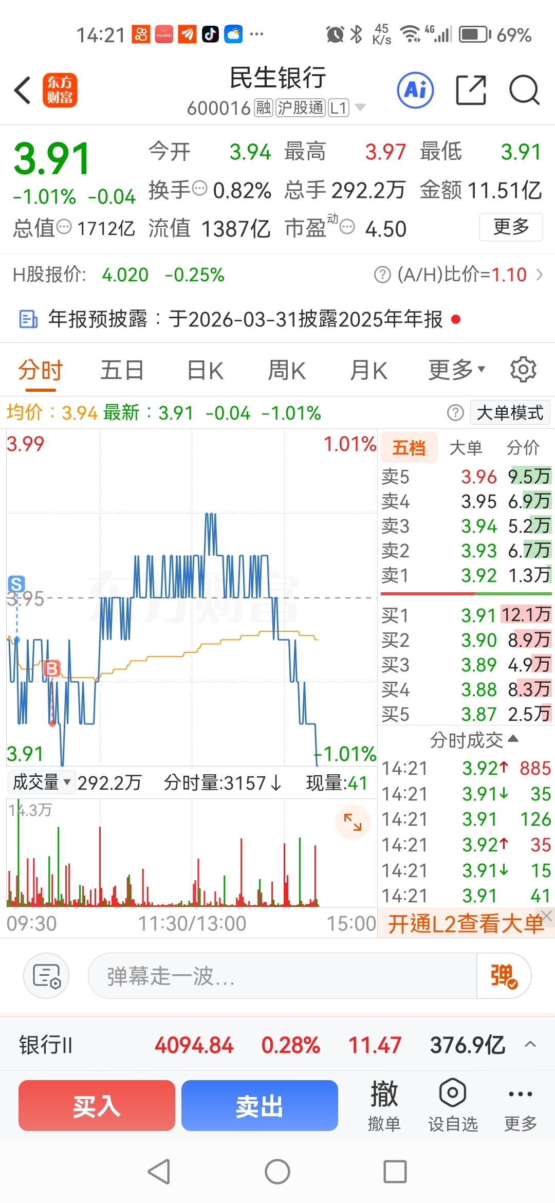 $民生银行(SH600016)$ 5千股做了两分钱的差价。白白高兴了一天。