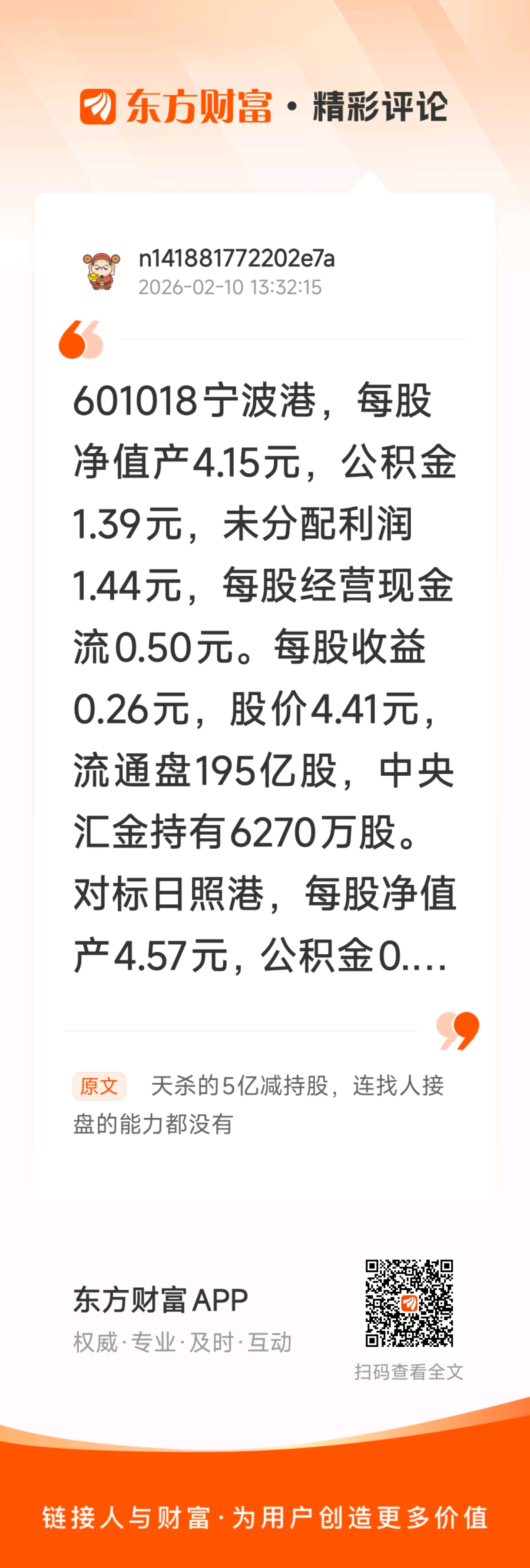 //@n141881772202e7a :601018宁波港,每股净值产4.15元,公积金1.39元,未分配利润1.44元,每股经营现金流0.50元。每股收益0.26元,股价4.41元,流通盘195亿股,中央汇金持有6270万股。对标日照港,每股净值产4.57元,公积金0.63元,未分配利润2.63元,每股经营现金流0.63元,股价3.13元,流通盘30亿股,中央汇金持5667万股,日照港还是没有台风的内陆港,得天独后的环境,上升浅力很大。