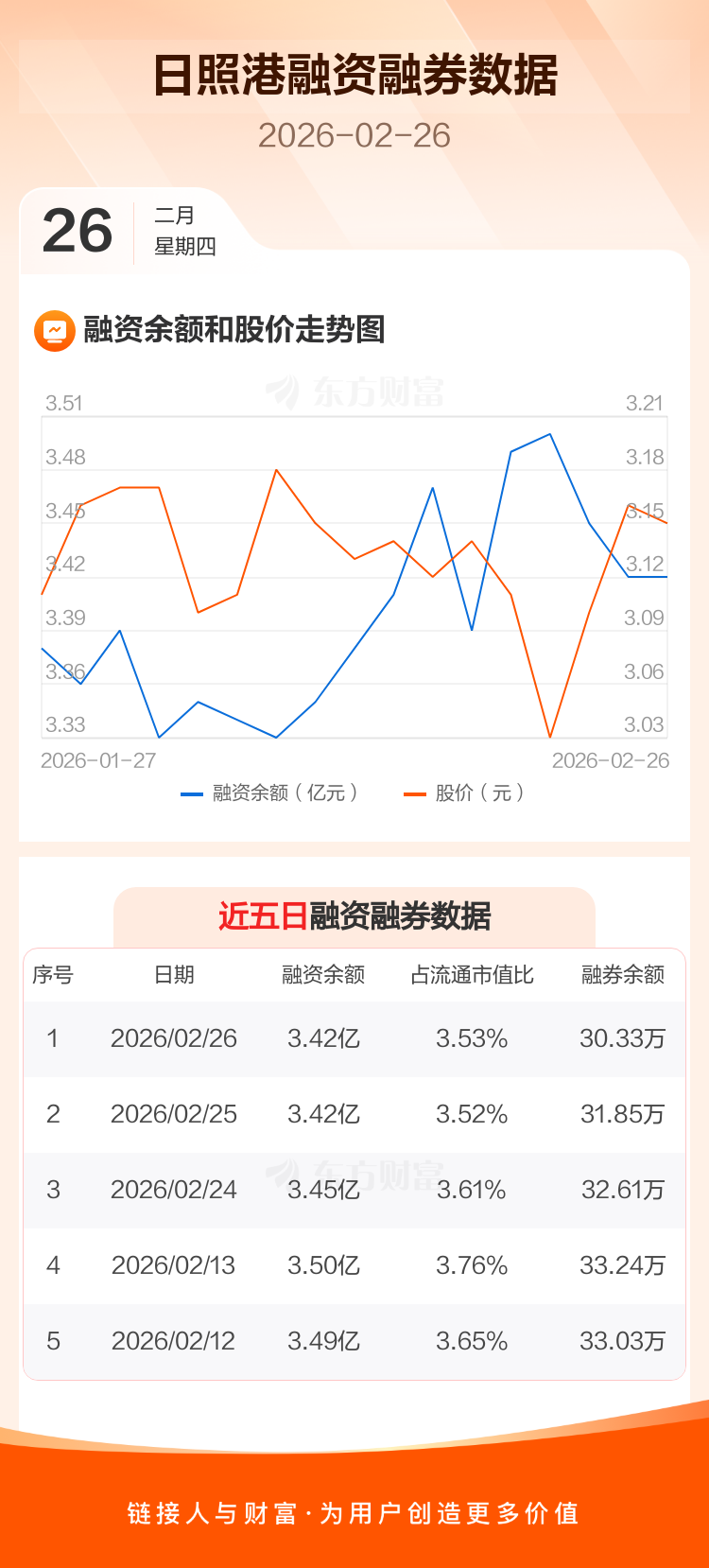 交易所最新数据显示,日照港于2026年2月26日获融资买入1850.99万元,融资偿还1776.76万元,当日融资净买入74.23万元。目前,该股融资余额3.42亿,占流通市值比例为3.53%。