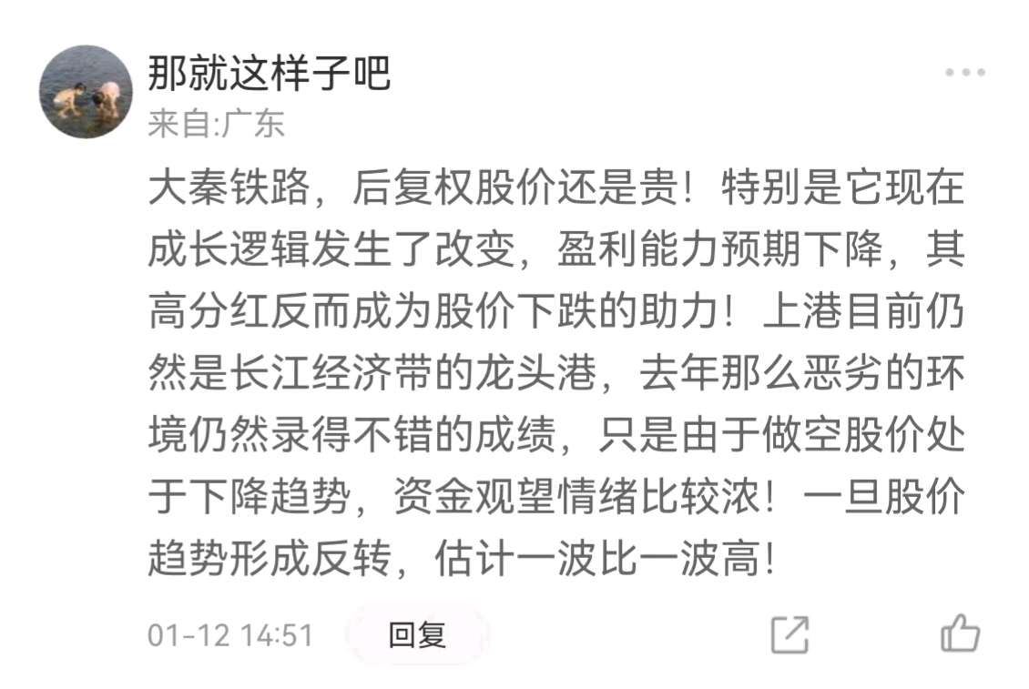 1月12号,大秦的股价是5.18上港是5.50,在那学士通过贬损大秦来唱多上港后