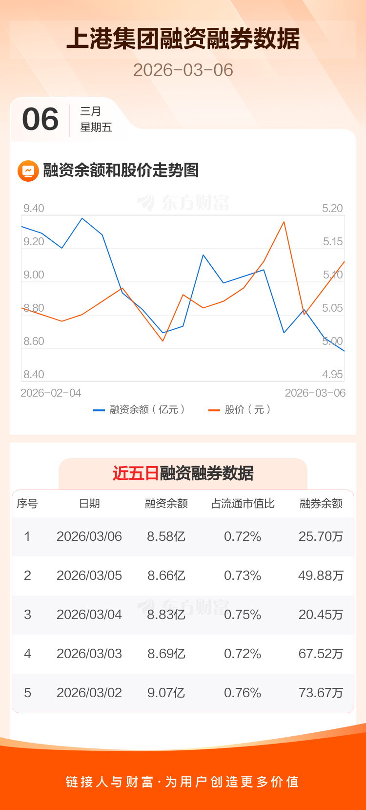 交易所最新数据显示,上港集团于2026年3月6日获融资买入1735.20万元,融资偿还2562.14万元,当日融资净偿还826.94万元。目前,该股融资余额8.58亿,占流通市值比例为0.72%。