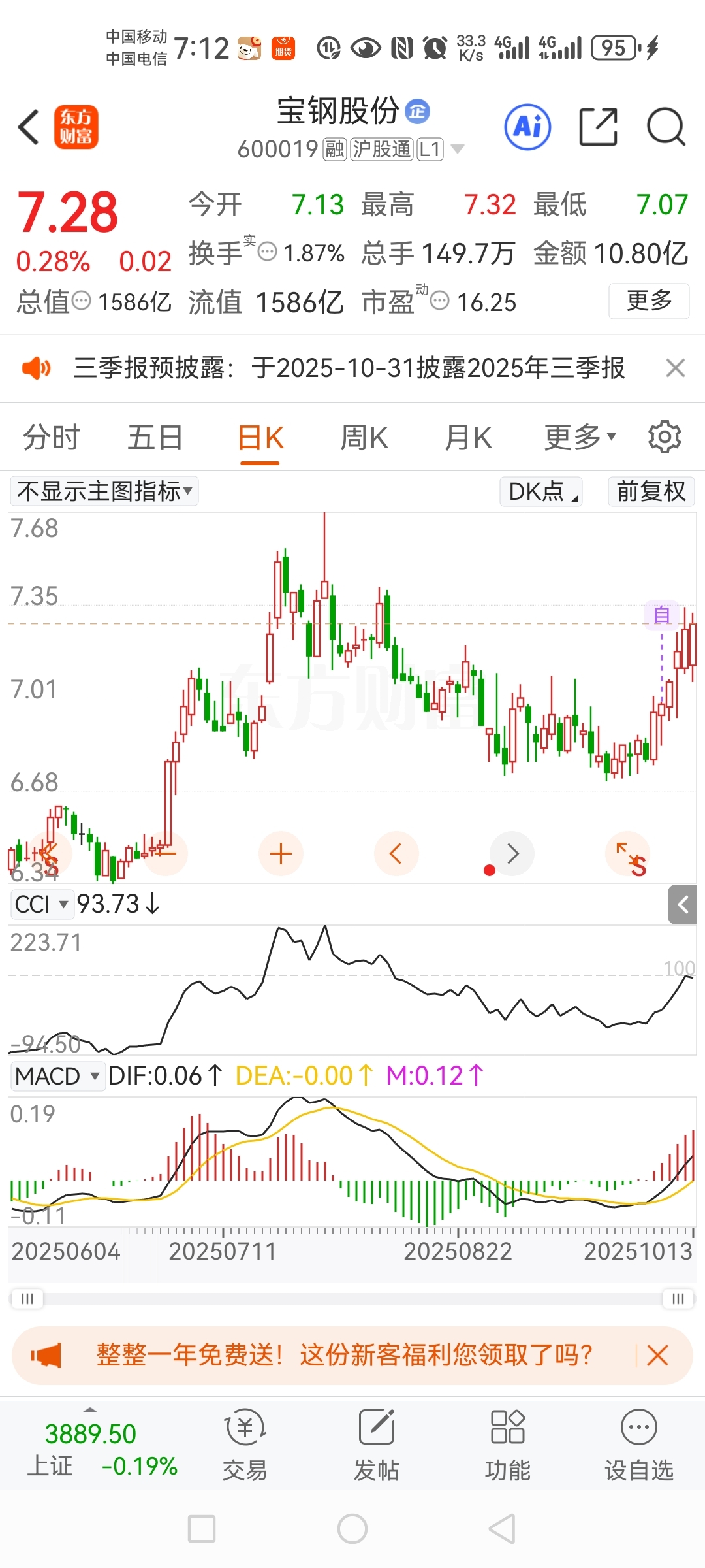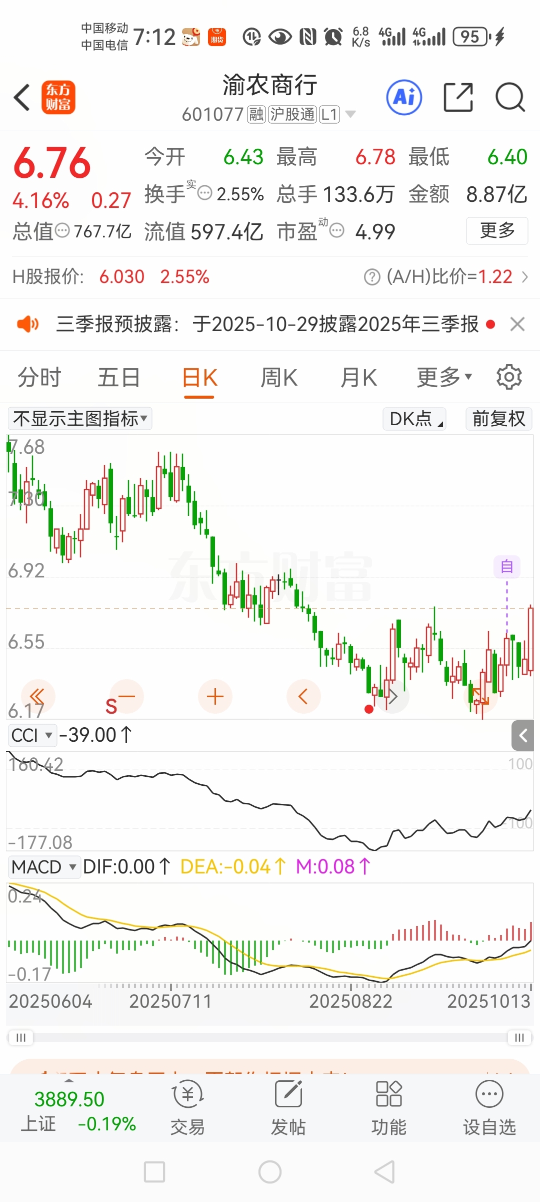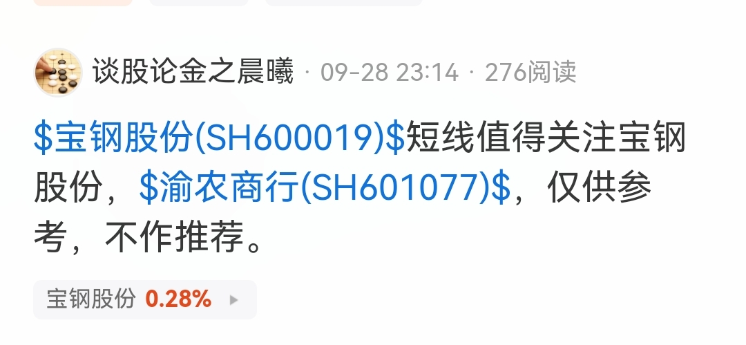 $宝钢股份(SH600019)$ $渝农商行(SH601077)$ 今天市场3600多家下跌,只有1600多家上涨,包括我9/28日提到的两家企业,虽然没有达到大多数人想像的今天涨停、明天涨停、后天涨停的局面,但相比今天亏、明天亏的状态好太多,事实上并非我抓不到涨停,而是我要不要抓和要不要发出来,早些日子提到的大众公用就经常涨停。好了不说了,说太多又要被喷了,因为不管你怎么做总有看不惯的人!