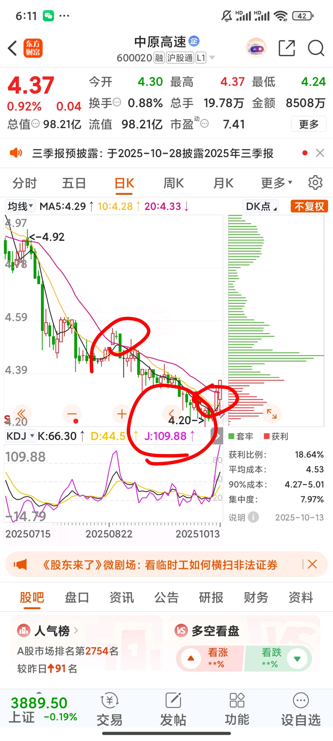 $中原高速(SH600020)$ j值都到了109了开始往下调整了回调到4元以下开始上攻