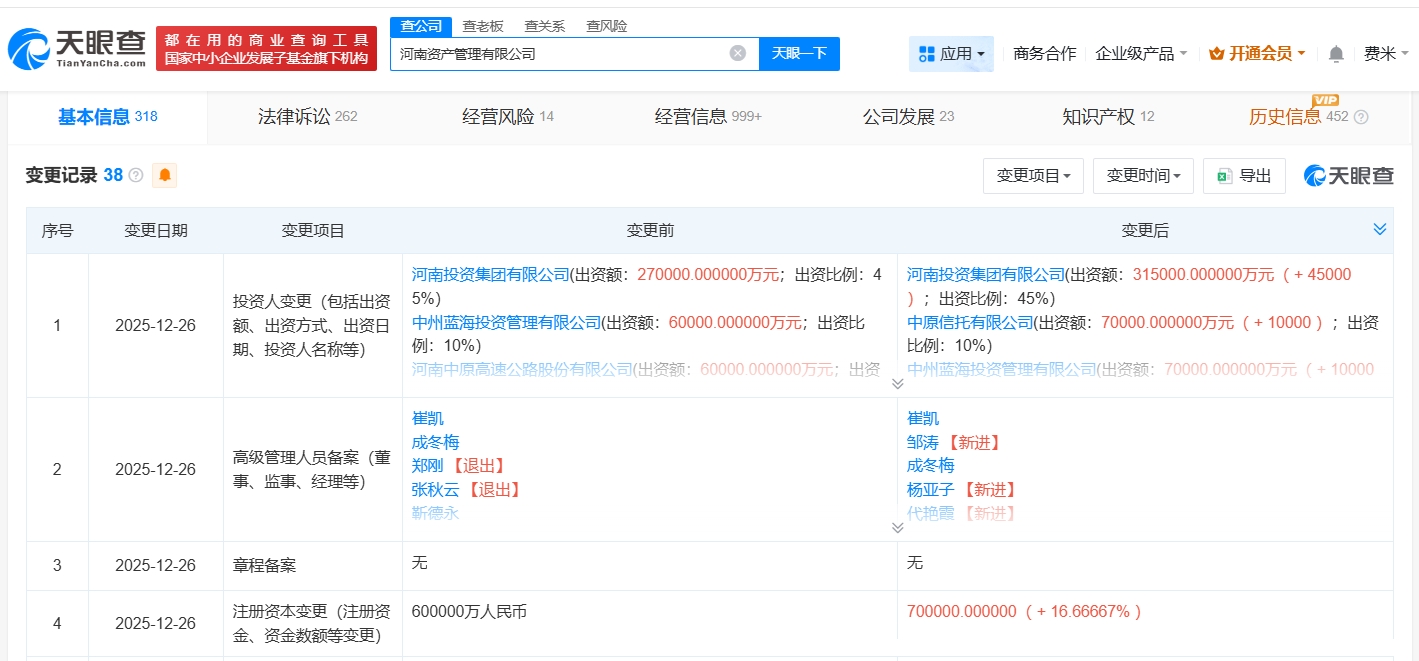 南方财经12月30日电,天眼查App显示,近日,河南资产管理有限公司发生工商变更,注册资本由60亿人民币增至70亿人民币,增幅约17%,同时,多位高管发生变更。该公司成立于2017年8月,法定代表人为成冬梅,经营范围包括投资及资产管理、私募基金管理、股权托管管理等,由河南投资集团有限公司、国投资产管理有限公司、中原高速(600020)等共同持股。