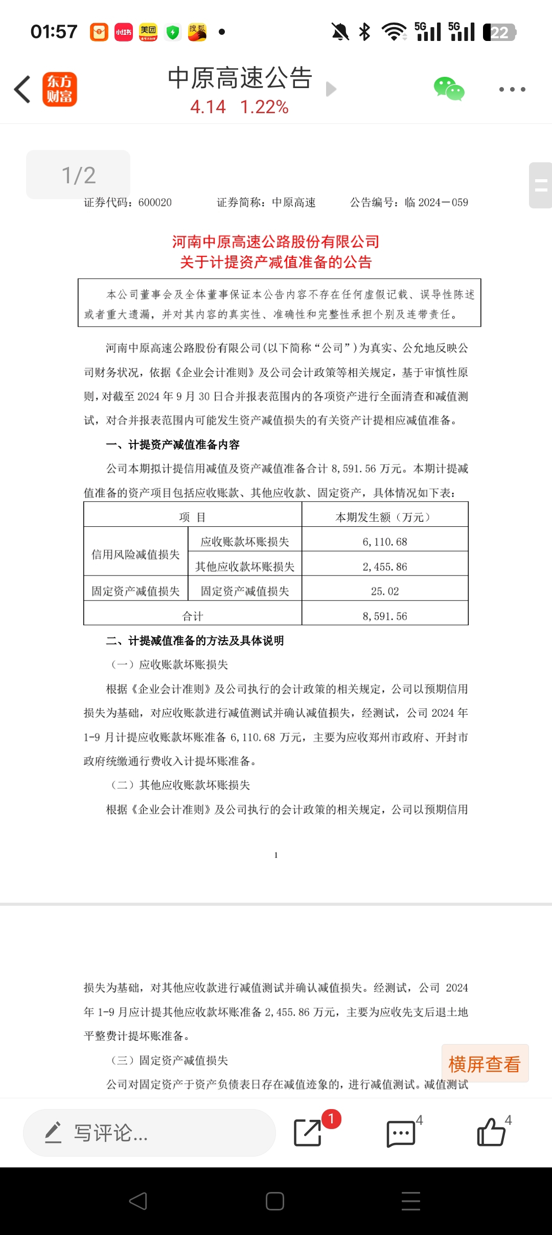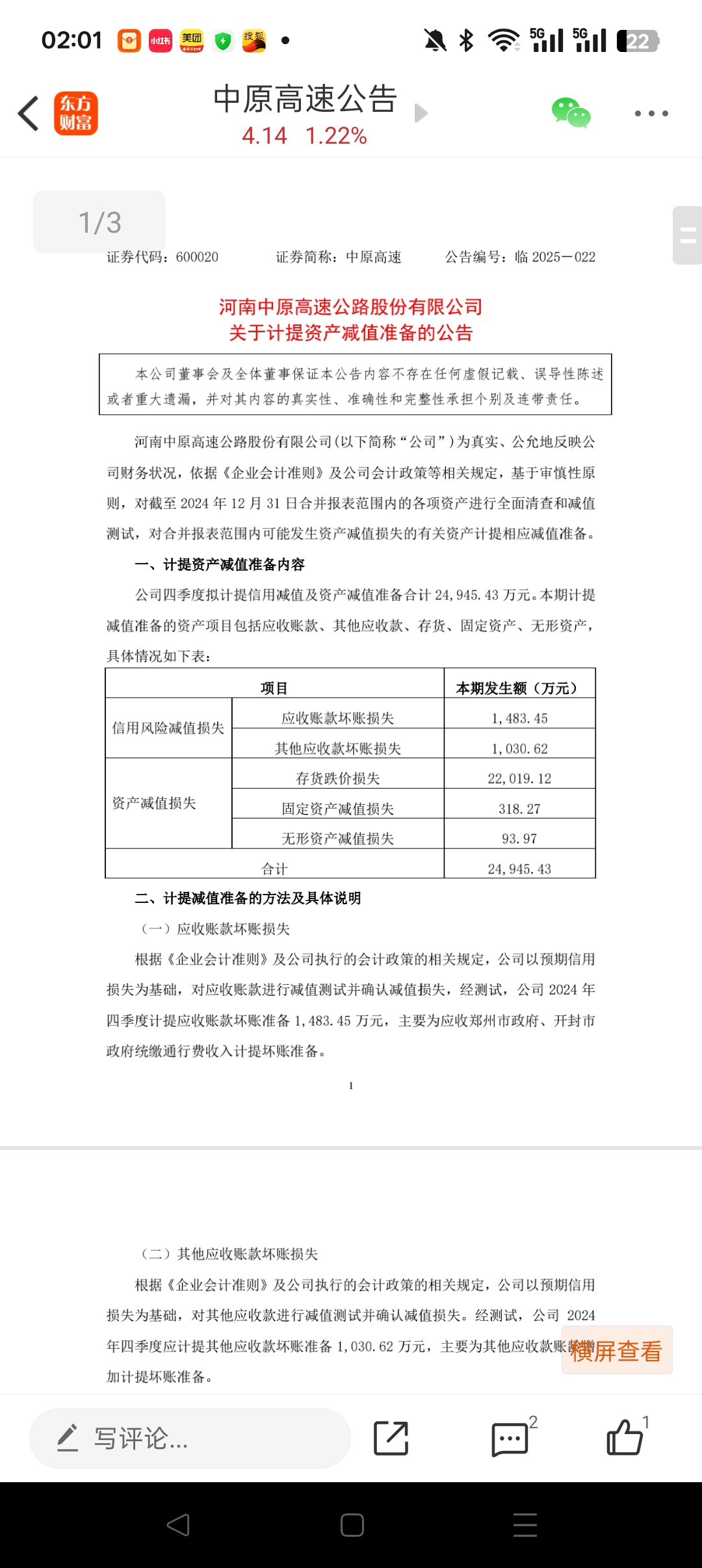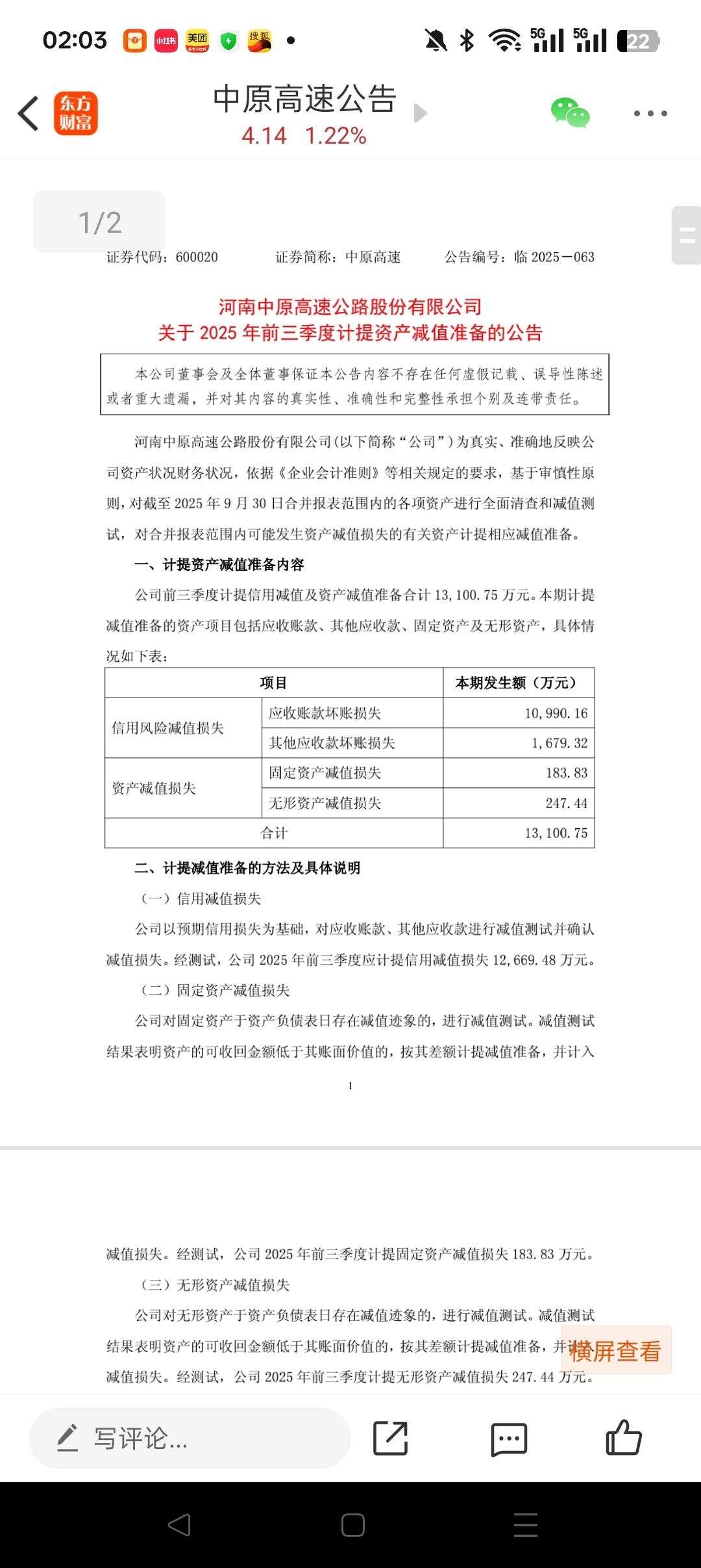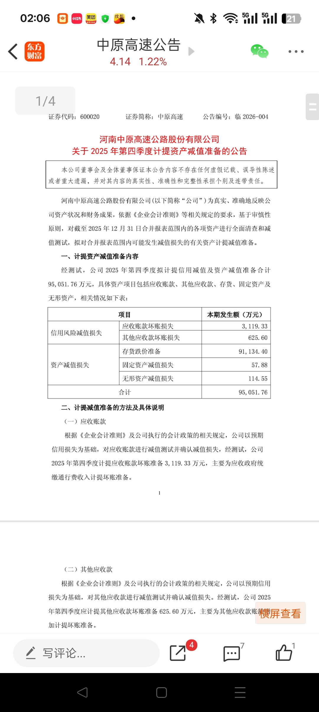 $中原高速(SH600020)$ 中原高速2024~2026年计提公告:2024年第一次:10130.81万元;2024年第二次: 8591.56万元;2025年第一次:24945.43万元;2025年第二次:13100.75万元;2026年第一次:95051.76万元…5次计提合计151820.31万元,平均每股计提0.6756元。