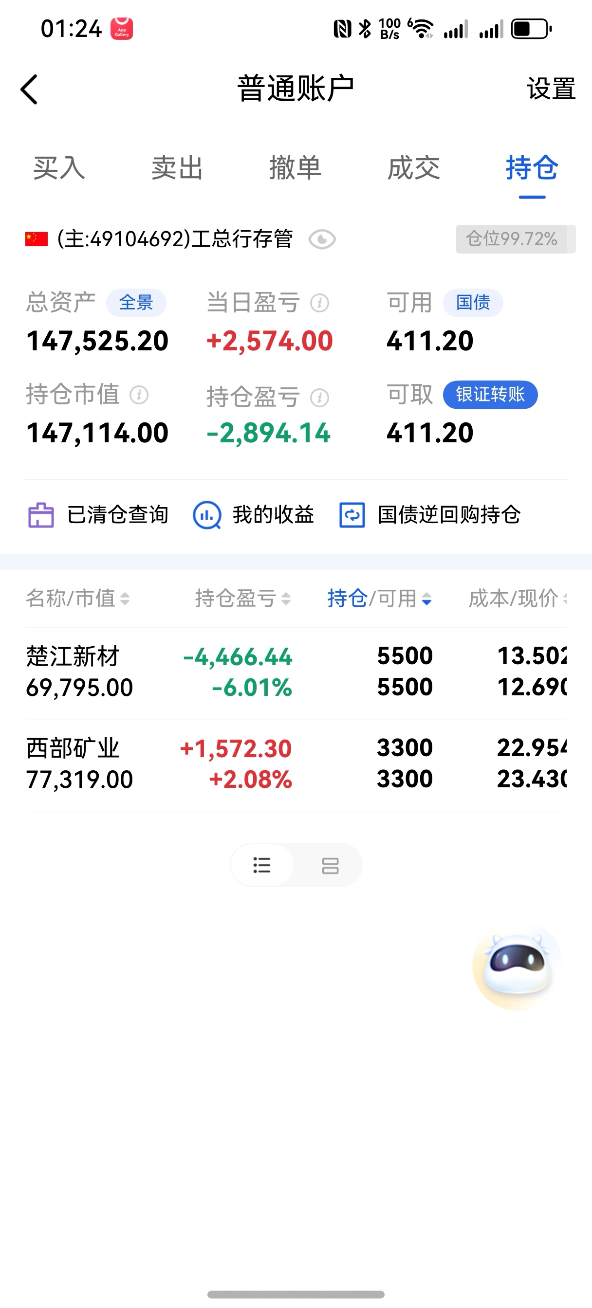 今天西部矿业卖了,小赚1500,楚江还在,感觉快反转了,这一波看24