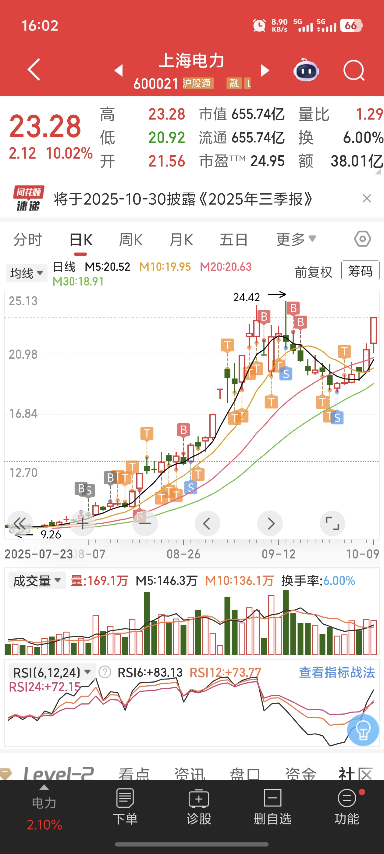 $上海电力(SH600021)$ 说了一动不动就不动,说实话明天想在24.42左右T一下,看看今晚有没有龙虎榜吧,如果不出榜那明天会不会控制3天20%?如果控制那就要在3个点左右才不会出,也就是冲高到5个点或者冲过去在回落3个点开始横盘?或者说主力预判大家,直接在24.42横一下冲过去封板或者拉到8个点横盘,让套牢做T的追高或者下车?欢迎讨论!