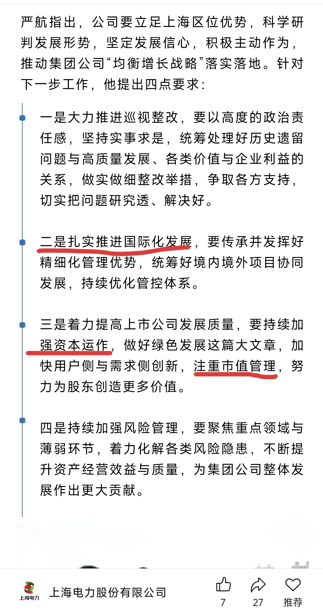 $上海电力(SH600021)$ 今天官网发文,提高市值管理,推进国际化发展