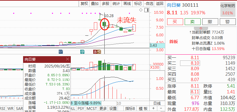 医药板块,但昨天涨停,包括前面的四连版涨停却不是因为医药属性,而是一则收购行为,公司拟收购兮璞材料100%股权与贝得药业40%股权,兮璞材料主营半导体级高纯电子特气、硅基前驱体、金属基前驱体等高端半导体材料,向日葵由此进入半导体材料赛道。这类材料是芯片制造的 “核心耗材”,覆盖晶圆加工、封装测试等关键环节,属于国家重点扶持的 “卡脖子” 领域,不仅能享受Z策红利,更能依托半导体产业的高增速实现价值跃升。收购贝得药业 40% 股权,意味着向日葵公司正式切入创新药领域。贝得药业聚焦的肿瘤靶向治疗等方向,对应着人口老龄化下的刚性医疗需求,市场规模稳定增长,而且2025年欧洲肿瘤内科学会(ESMO)年会定于10月17日至10月21日在德国柏林举行,这个题材也起助推作用。昨天的20CM涨停板反包了全面的6根调整阴线,从分布图上看,9月26日大分裂的当天筹玛并没有流失,不排除当前的涨停是自救行为,有望完成N型反抽结构。