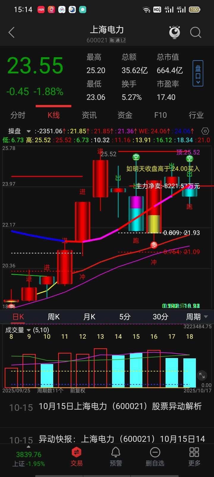 $上海电力(SH600021)$ 已震荡20个交易日,下周突破25.52的概率达到75%