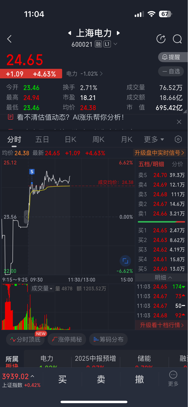 $上海电力(SH600021)$ 拿不住,先撤了,几百亿的市值分时像个微盘股