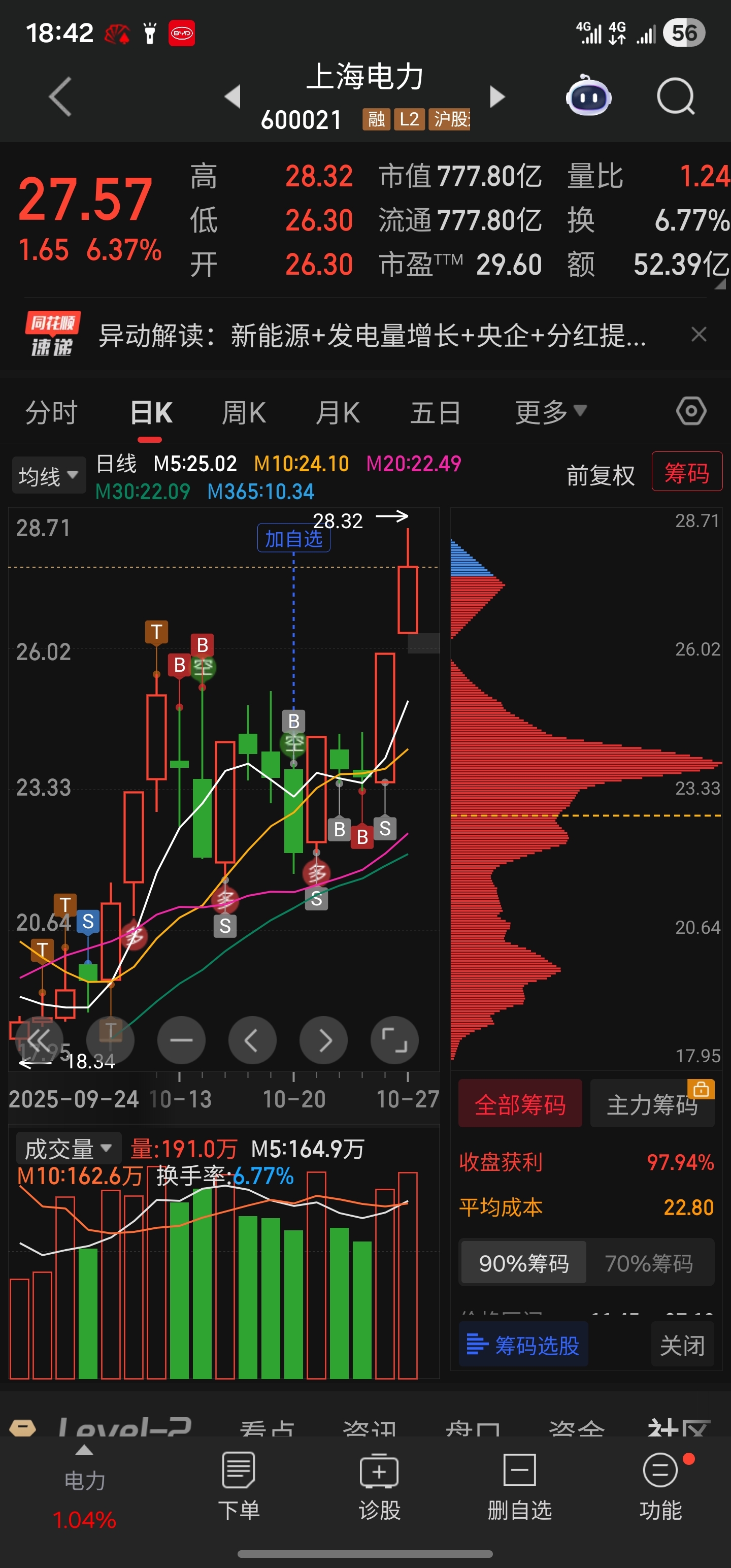 上海电力拿了两个月,本来打算周五卖出今天下跌买回,既然没有下跌那就再见吧