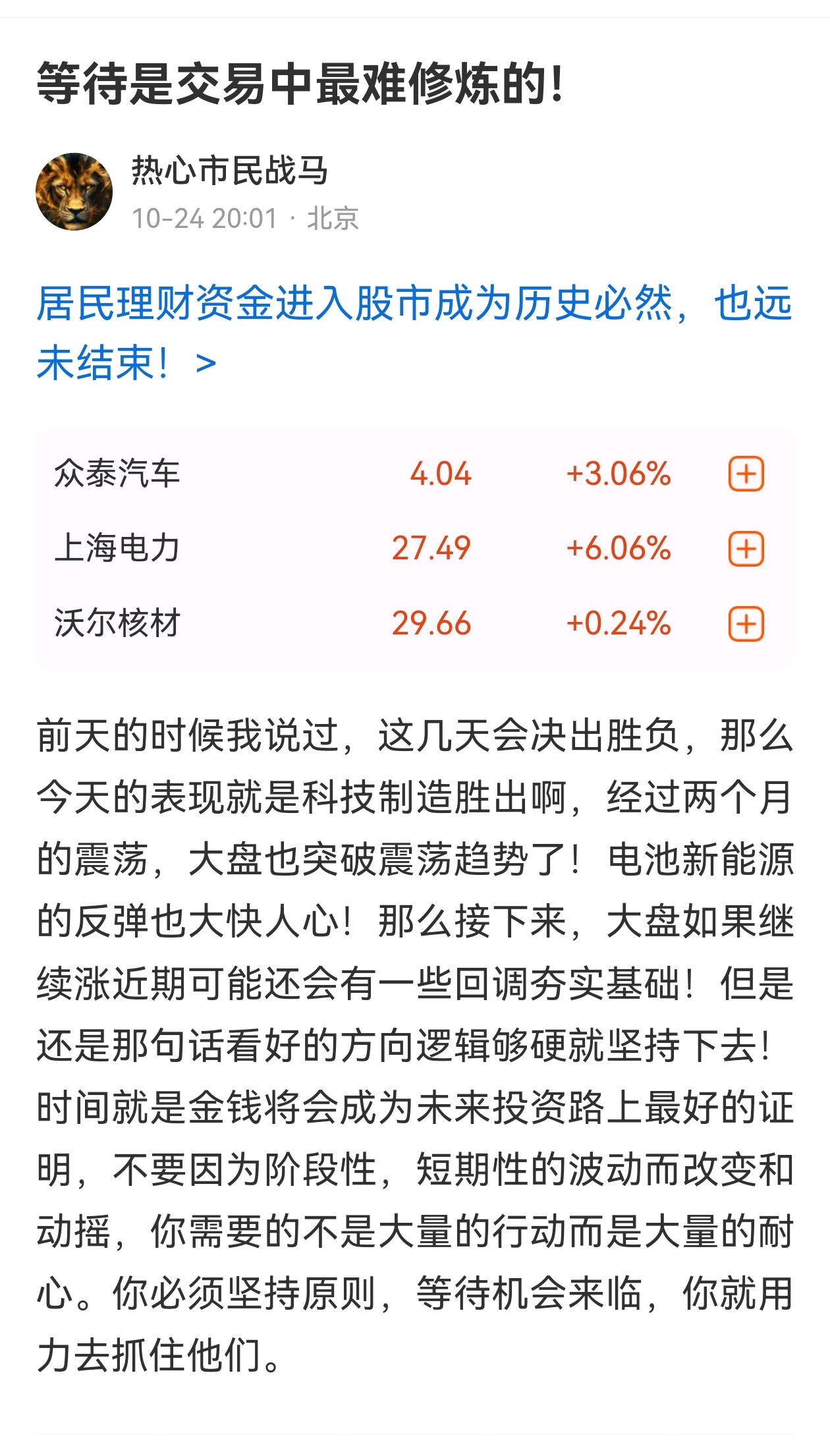 $上海电力(SH600021)$ 还是原来的看法,$众泰汽车(SZ000980)$ 多一些耐心,不要急躁。市场本来就是心理的对抗,变着法儿的激起你的情绪,让你做出一些非理性的抉择。