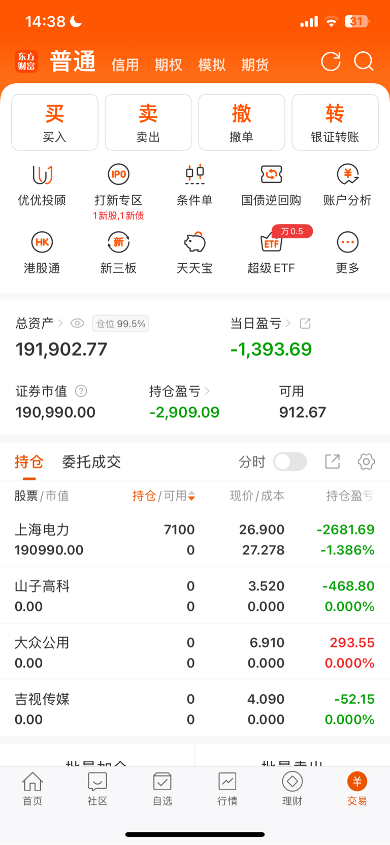 清仓所有股票,全仓上海电力,年前博一把,跌了就弄资金补,万一成功呢