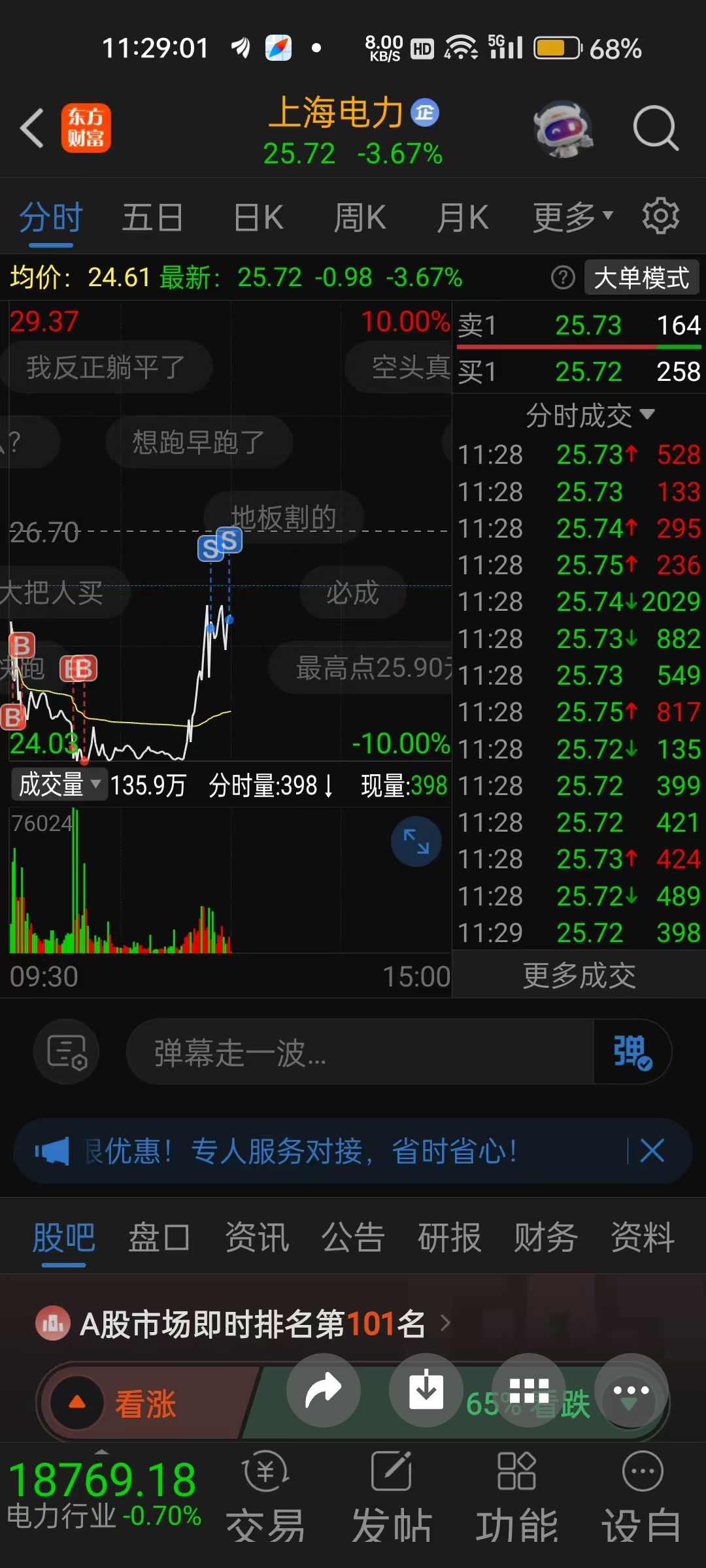 $上海电力(SH600021)$ 这一二T的舒服,28元82的成本,T成了26元06,今天下跌3个多点,今天账户还翻红盈了。感谢雪球,感谢主力。