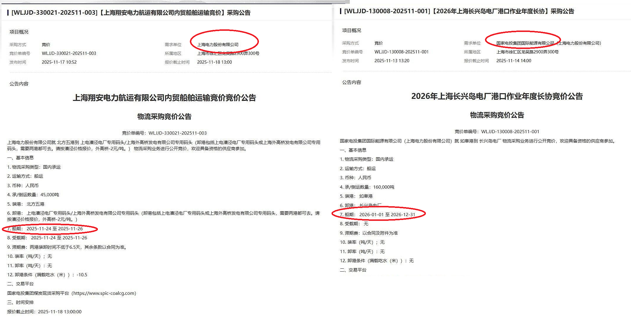 对比招标采购公告,2025的船期还是上海电力,2026年的船期已经统一用电投国际名字下单了!!