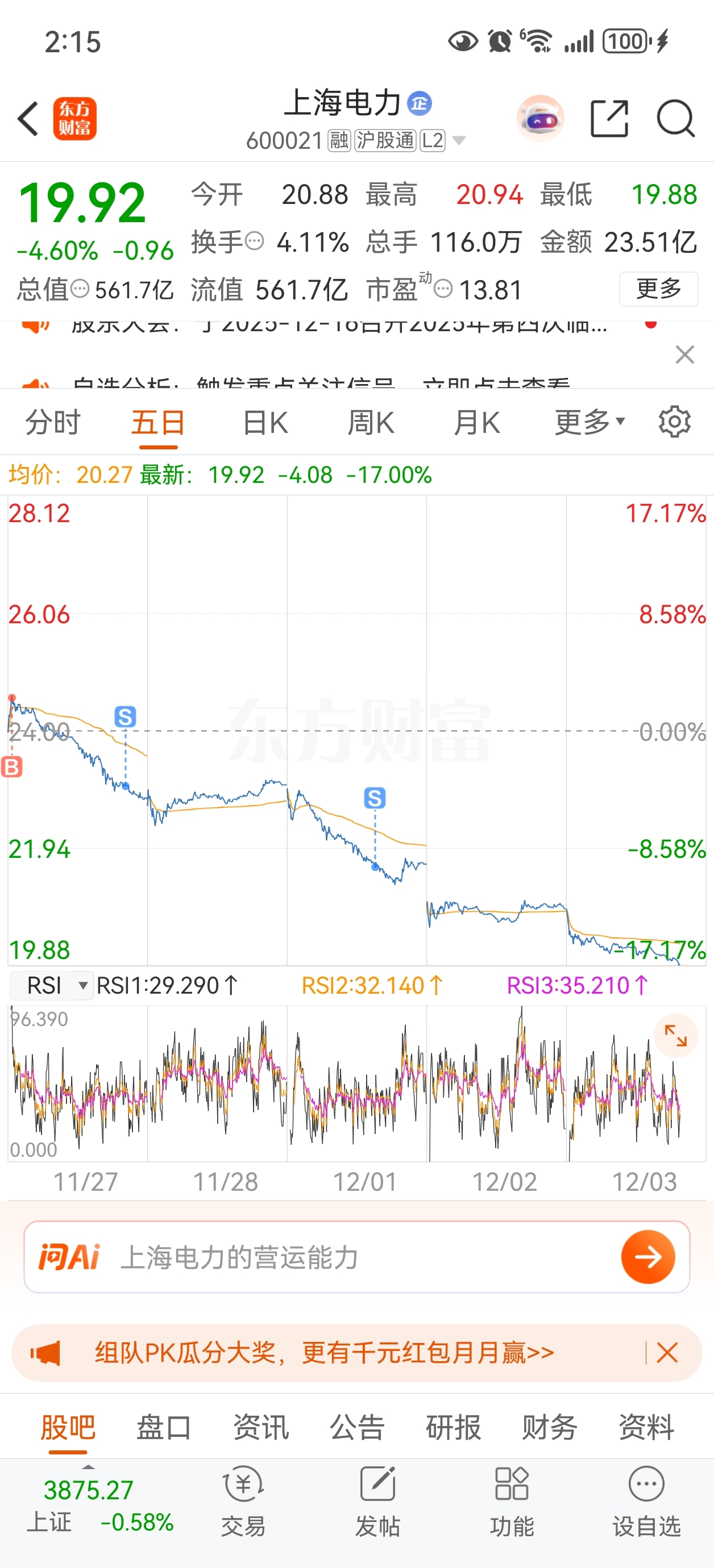 $上海电力(SH600021)$ 亏几千割了,有时候狠心也是好事。看着它这样跌,散户真的太惨了