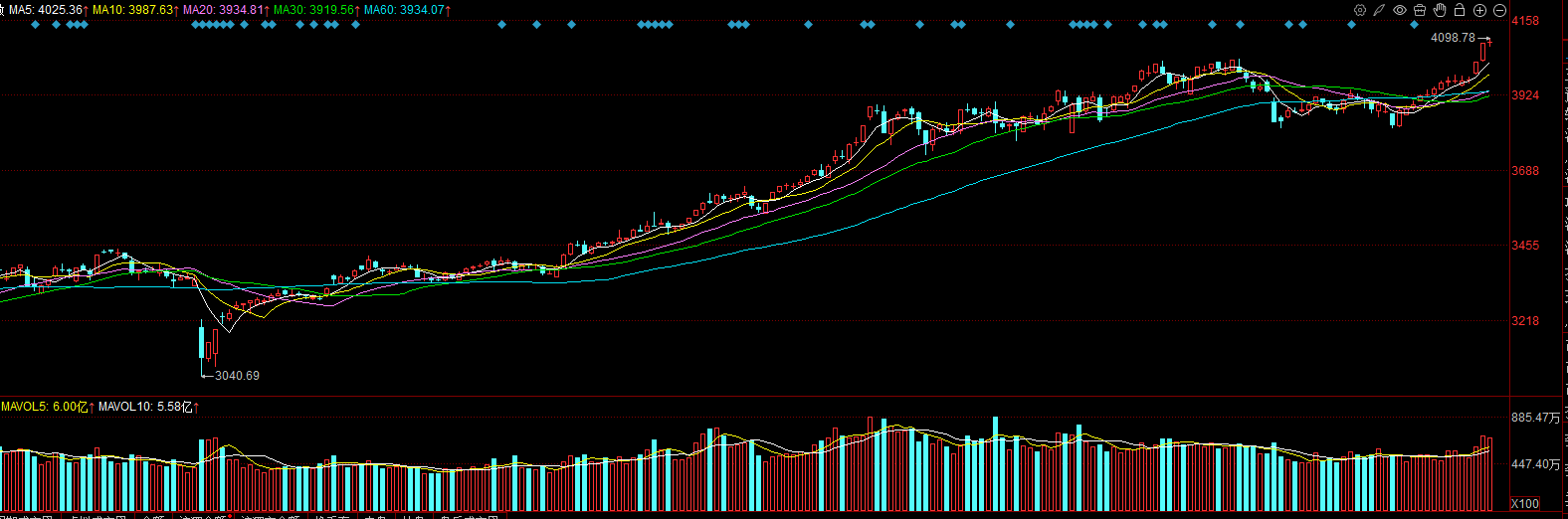 大盘周三已经走出14连阳,期间两次大跳水都能顽强反弹,核心支撑就是市场成交量没有萎缩,反而还在放量。不过周四周五这两天如果成交量开始缩量,大盘预计会围绕4040点震荡蓄势,之后再寻求突破。