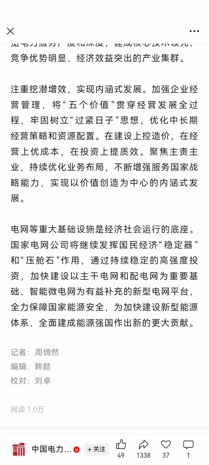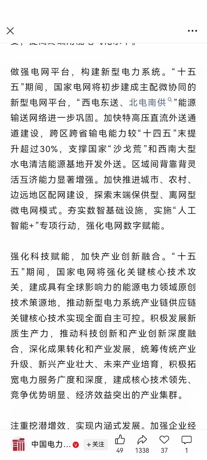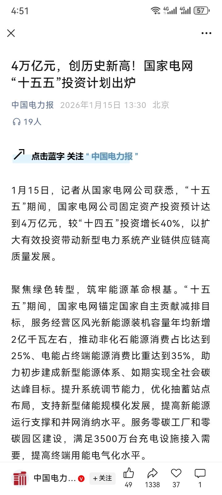 $上海电力(SH600021)$ 1月15日,记者从国家电网公司获悉,“十五五”期间,国家电网公司固定资产投资预计达到4万亿元,较“十四五”投资增长40%,以扩大有效投资带动新型电力系统产业链供应链高质量发展。