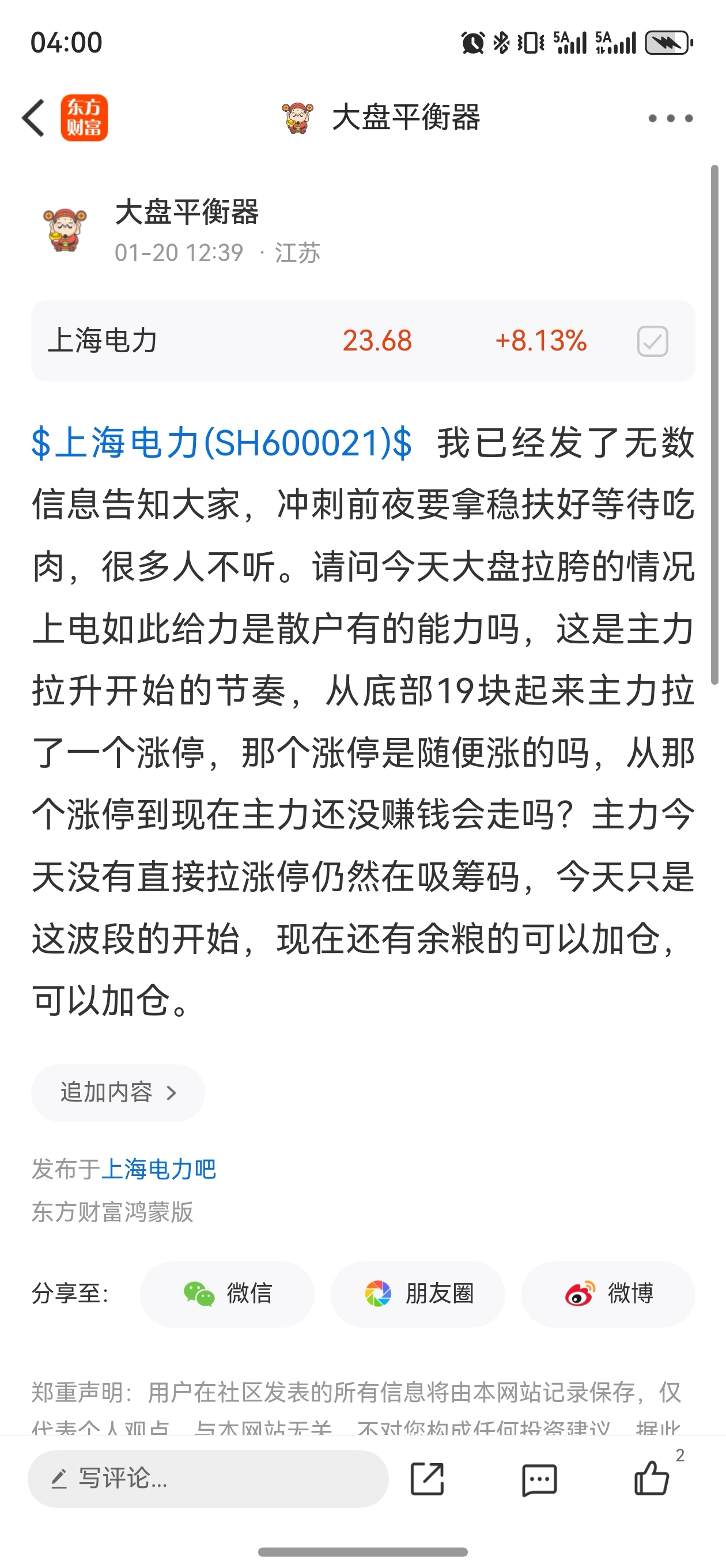 温馨提示: 1.根据《证券法》规定,禁止编造、传播虚假信息或者误导性信息,扰乱证券市场;2.用户在本社区发表的所有资料、言论等仅代表个人观点,与本网站立场无关,不对您构成任何投资建议。用户应基于自己的独立判断,自行决定证券投资并承担相应风险。《东方财富社区管理规定》