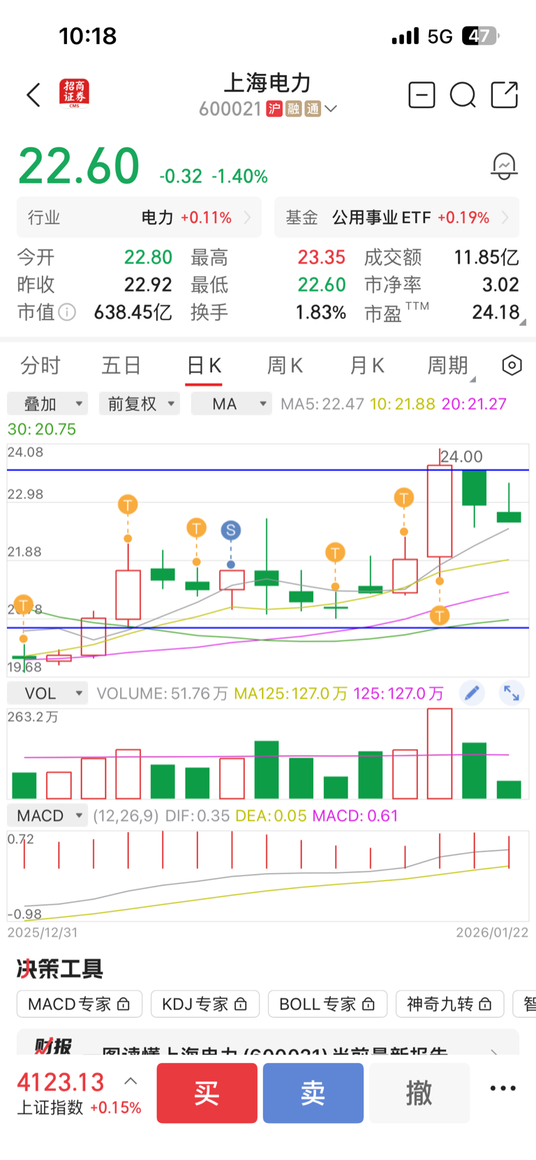 $上海电力(SH600021)$ 还是那句话,等回踩五日线,看看是否有承接是否站稳,多看少动,就算不回踩,直接放量突破23.6,毫不犹豫加仓
