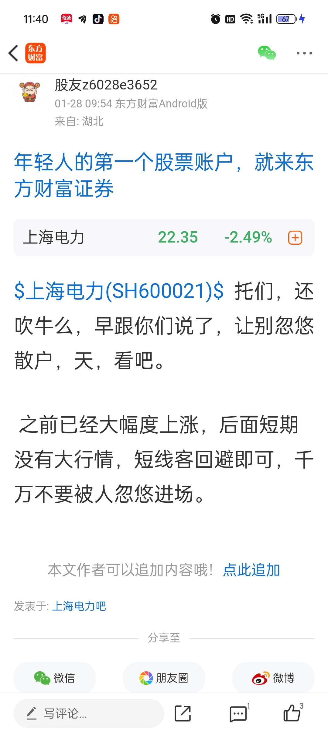 温馨提示: 1.根据《证券法》规定,禁止编造、传播虚假信息或者误导性信息,扰乱证券市场;2.用户在本社区发表的所有资料、言论等仅代表个人观点,与本网站立场无关,不对您构成任何投资建议。用户应基于自己的独立判断,自行决定证券投资并承担相应风险。《东方财富社区管理规定》