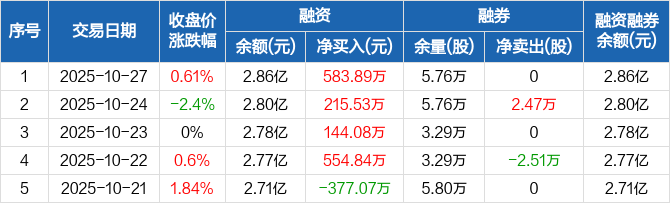 融资方面,当日融资买入2321.42万元,融资偿还1737.53万元,融资净买入583.89万元,连续4日净买入累计1498.34万元。融券方面,融券卖出2.47万股,融券偿还2.47万股,融券余量5.76万股,融券余额9.45万元。融资融券余额合计2.86亿元。