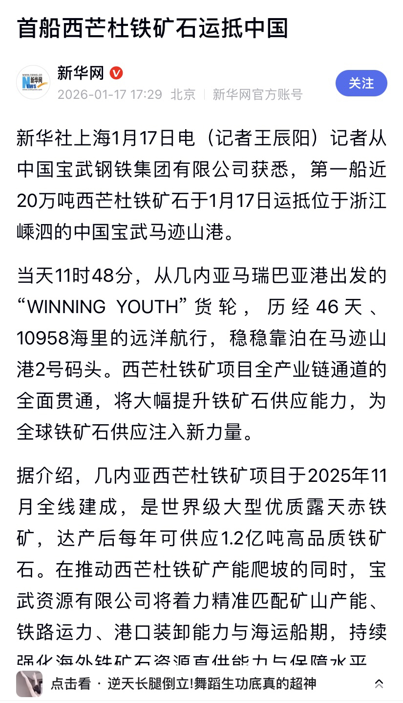 $山东钢铁(SH600022)$ 首船西芒杜铁矿石运抵中国,