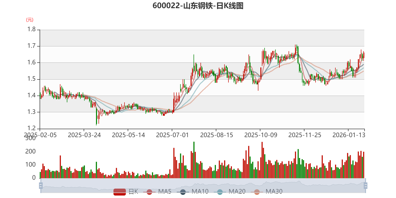 据公告,公司业绩变动原因为, 2025年钢铁行业市场环境复杂多变,公司牢牢把握中国宝武战略投资山钢集团、宝钢股份参股日照公司和宝钢股份一体化协同支撑重要机遇,抢抓采购端价格下行以及销售端季节性市场行情,以变革破局突围,深化对标找差,围绕提效率、降成本、拓市场、调结构、强协同五大主线精准发力:生产运行总体平稳,全年吨钢降本超70元;推行“聚量采购”模式,同步落地“战略采购+公开竞价”双轨机制,持续优化原料及备件采购成本,从严从紧压缩各项付现费用;大力开拓海外市场,聚焦高性价比产品出口规模扩容,构建稳定的海外营收增长渠道,全年出口结算量突破126万吨;科学管控螺纹钢等长材产量,通过收购银山型钢实现产品结构进一步优化;积极推进智慧制造转型,借助控股子公司山信软件信息产业平台快速建设投运“AI+钢铁”场景应用项目,助力提高生产效率、降低运行成本。
