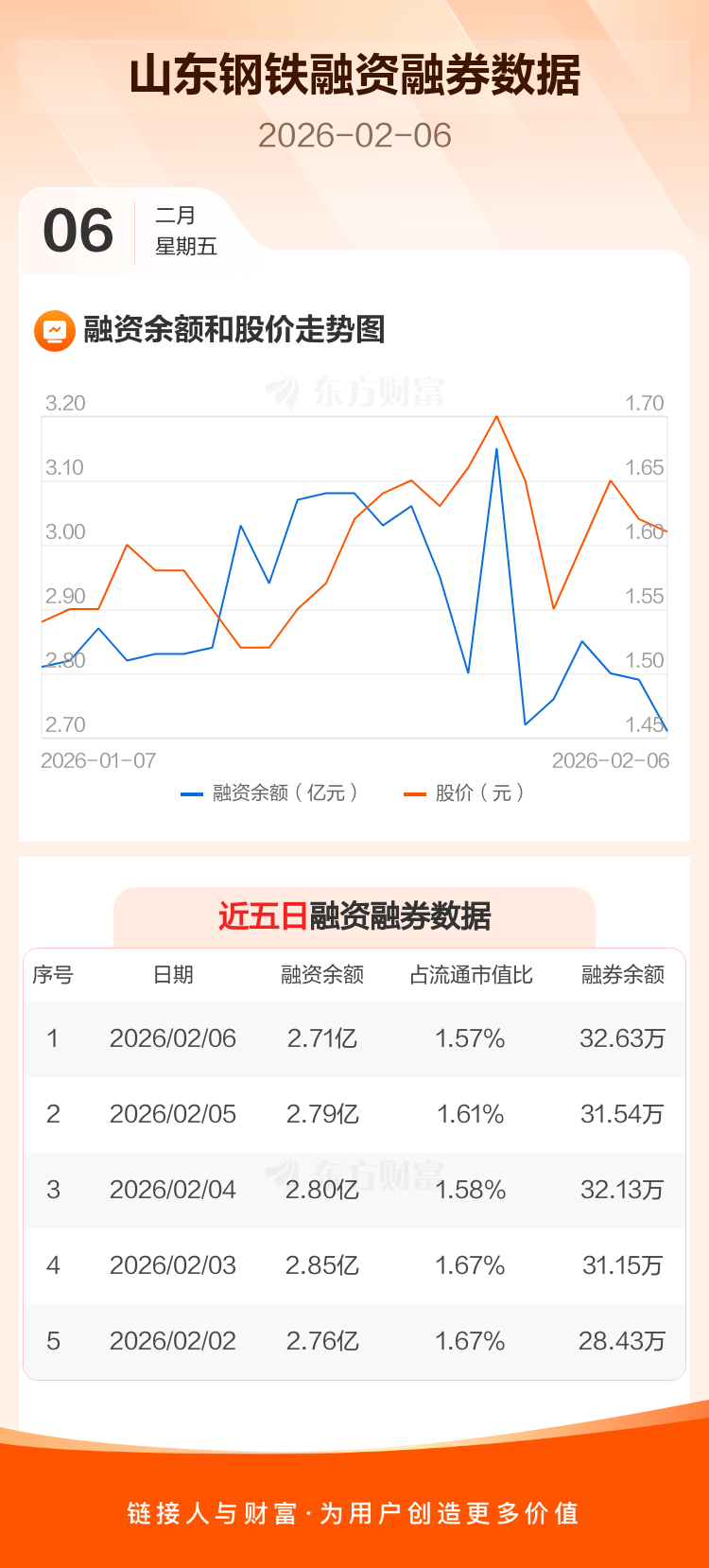 交易所最新数据显示,山东钢铁于2026年2月6日获融资买入1726.25万元,融资偿还2606.26万元,当日融资净偿还880.01万元。目前,该股融资余额2.71亿,占流通市值比例为1.57%。