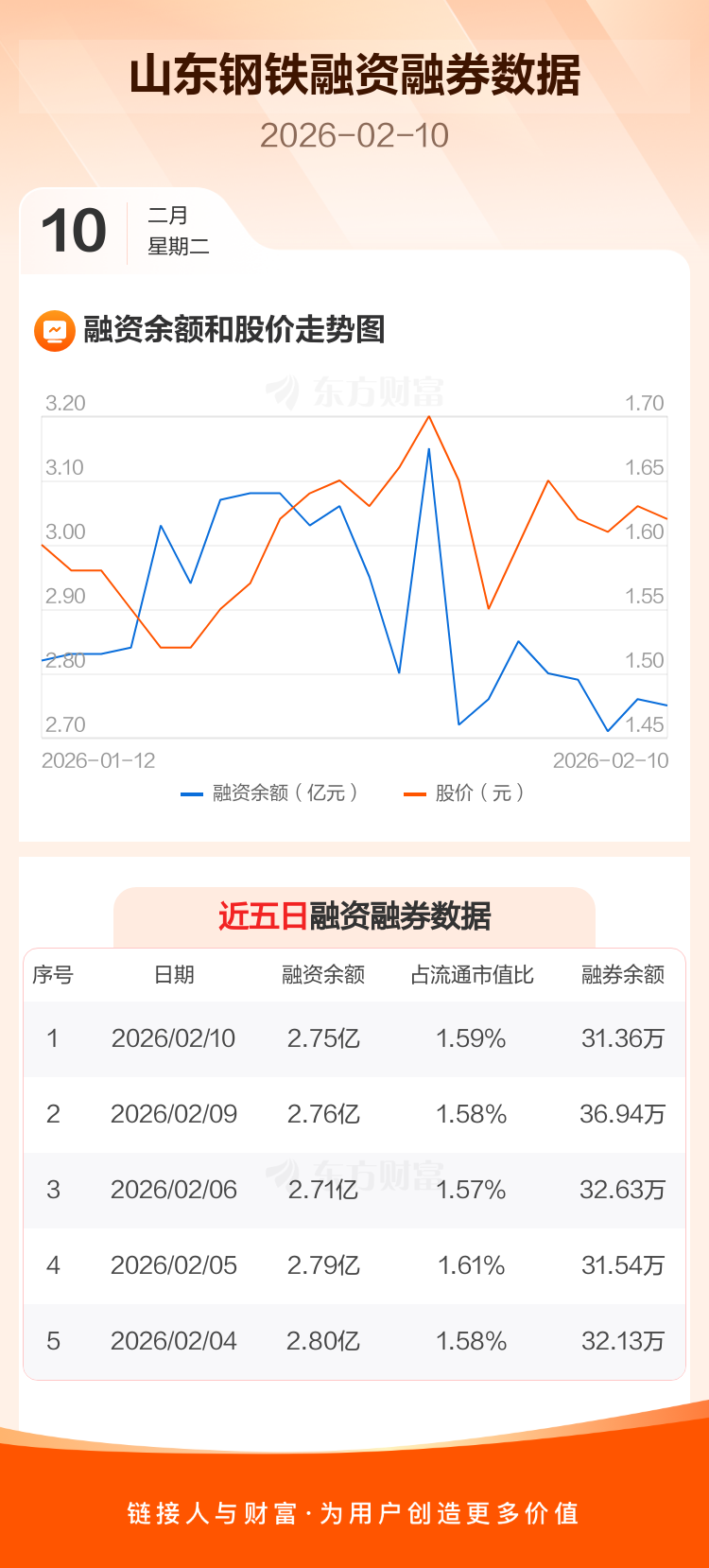 交易所最新数据显示,山东钢铁于2026年2月10日获融资买入1183.00万元,融资偿还1230.29万元,当日融资净偿还47.28万元。目前,该股融资余额2.75亿,占流通市值比例为1.59%。