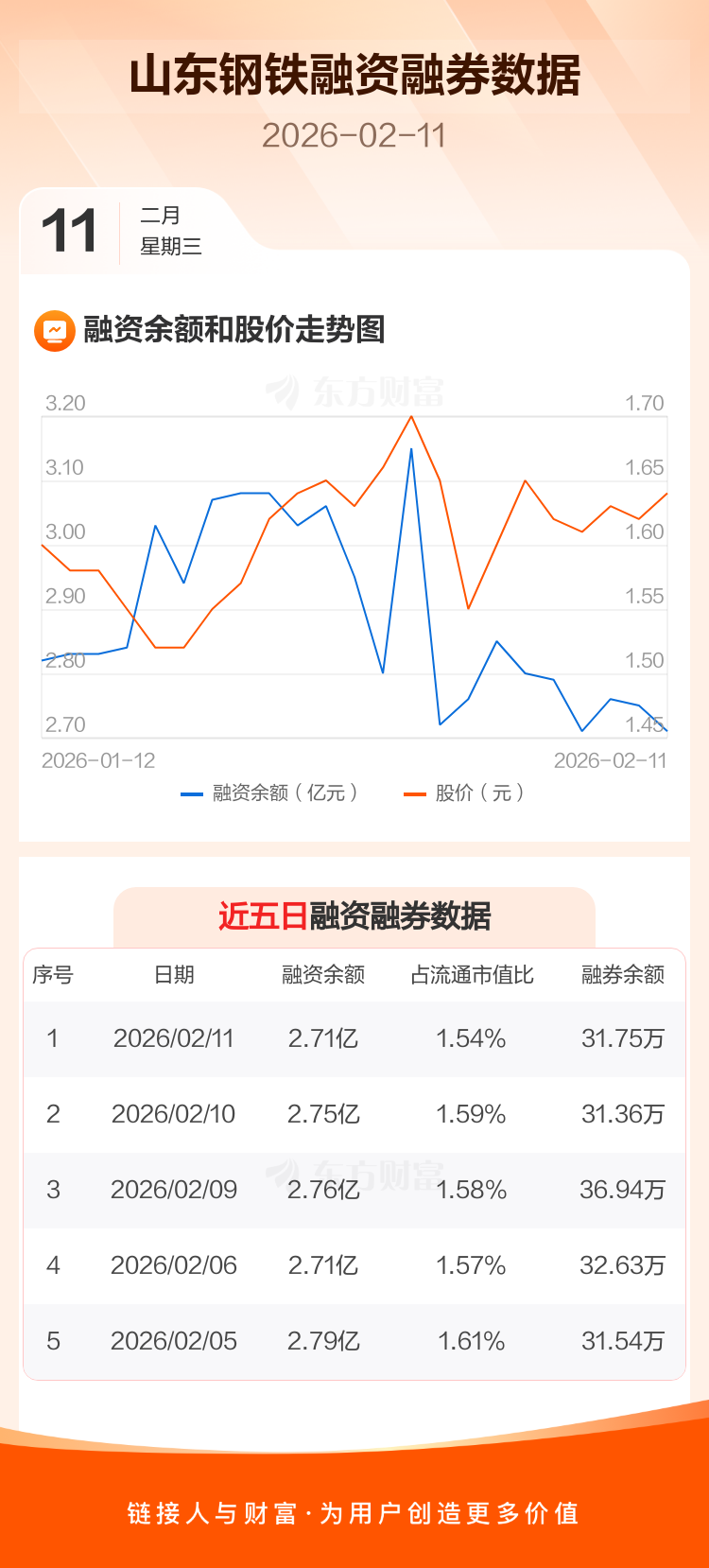 交易所最新数据显示,山东钢铁于2026年2月11日获融资买入1285.39万元,融资偿还1748.98万元,当日融资净偿还463.59万元。目前,该股融资余额2.71亿,占流通市值比例为1.54%。