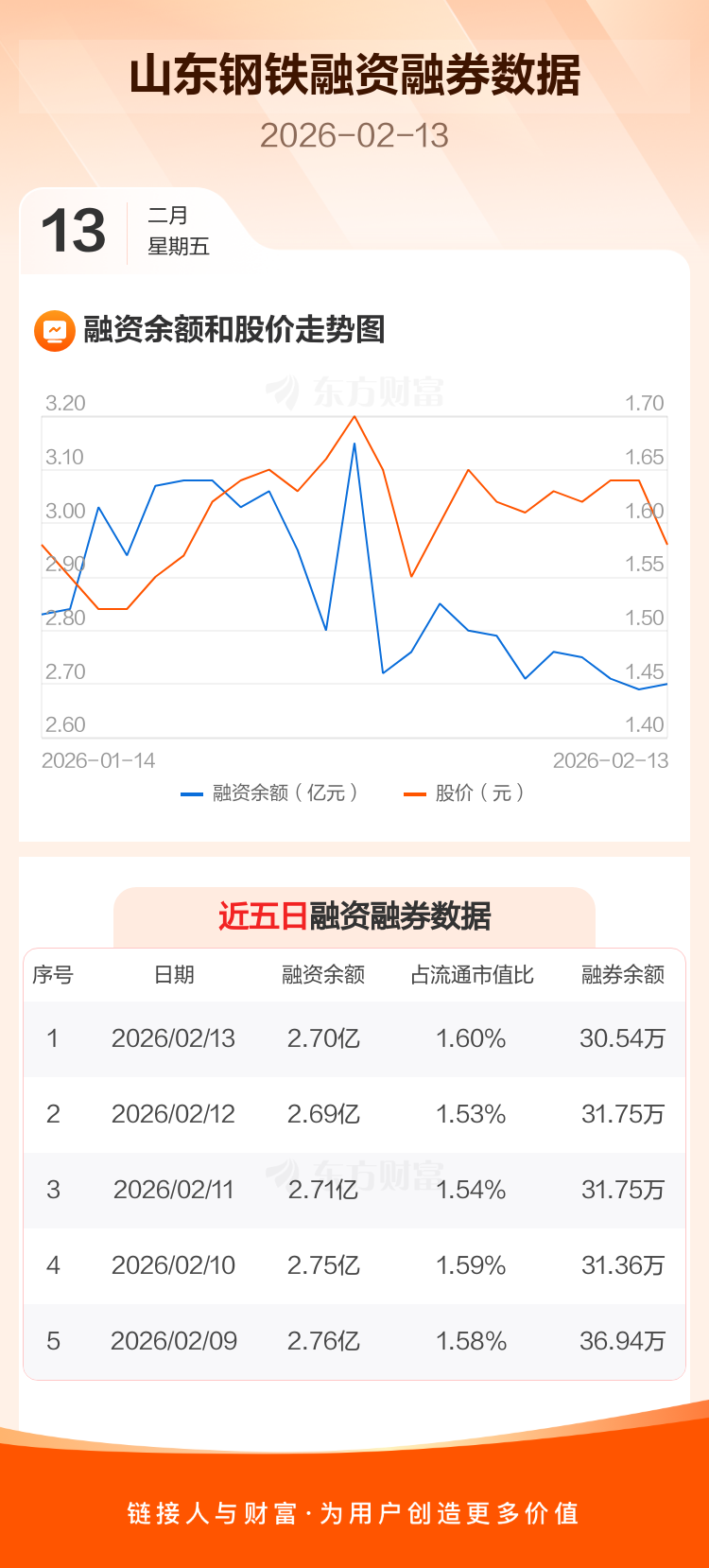 交易所最新数据显示,山东钢铁于2026年2月13日获融资买入1633.39万元,融资偿还1506.32万元,当日融资净买入127.07万元。目前,该股融资余额2.70亿,占流通市值比例为1.60%。