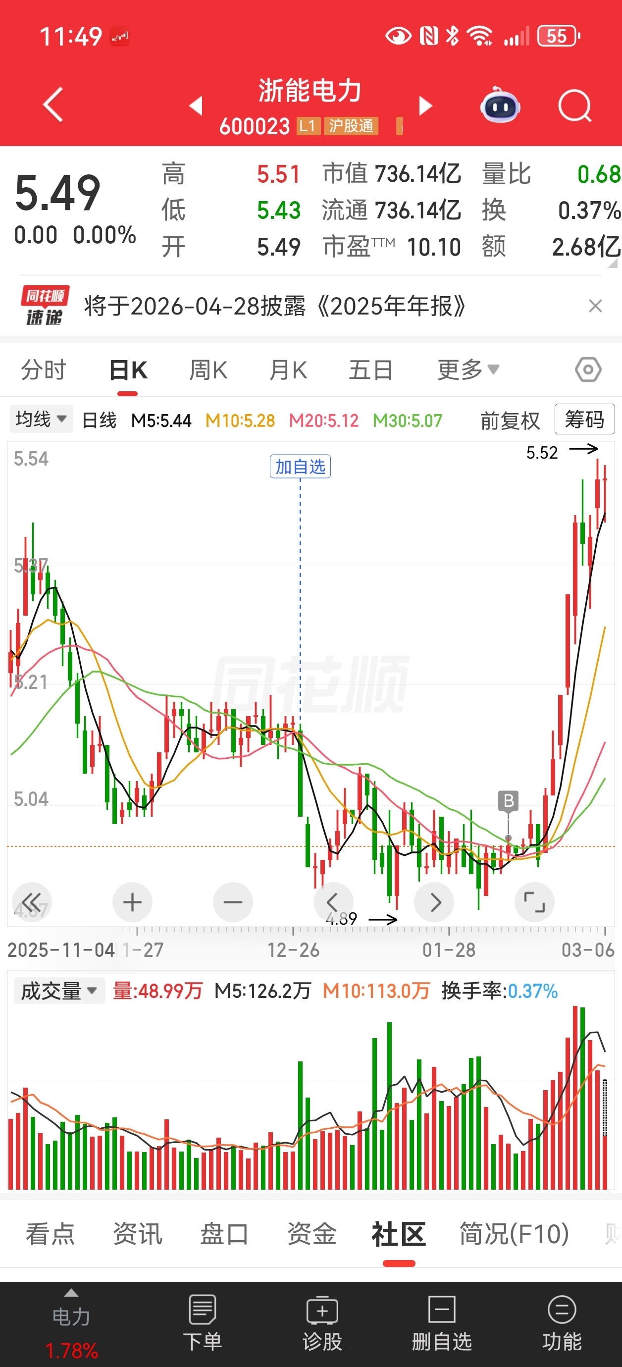 $浙能电力(SH600023)$ 好家伙,才加入自选没几天,横住了,有业绩,价格低,有分红,我心想,机会不就来了吗,结果回头一看涨了这么多,坏消息是买少了