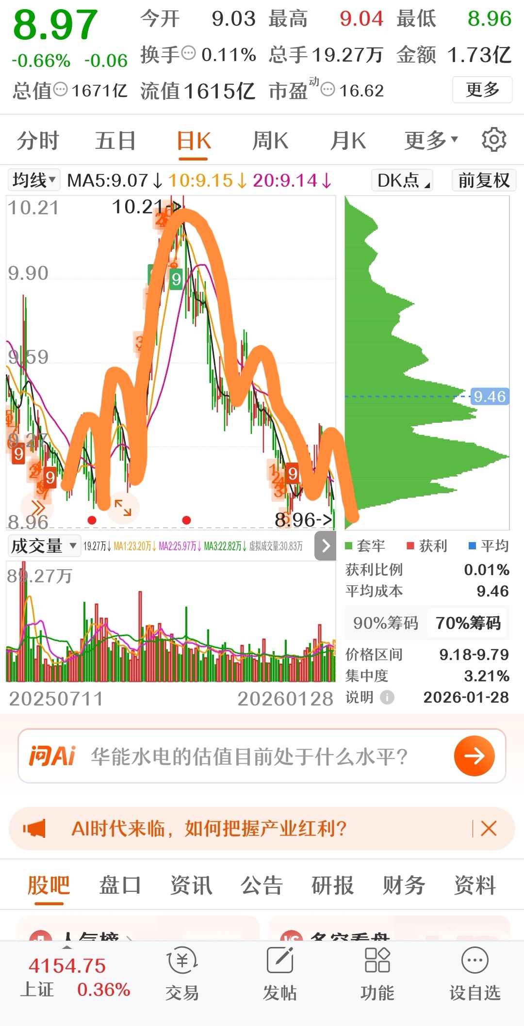 $华能水电(SH600025)$ 日线走势图形嘲讽拉满