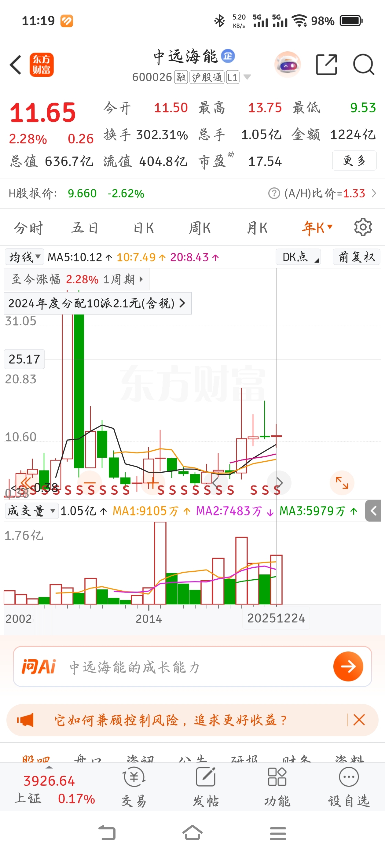 $中远海能(SH600026)$ 港股年涨幅61%,招商轮船年涨幅41%,中远海能年涨幅2%,不知道哪来的脸还天天跟着港股和轮船走。
