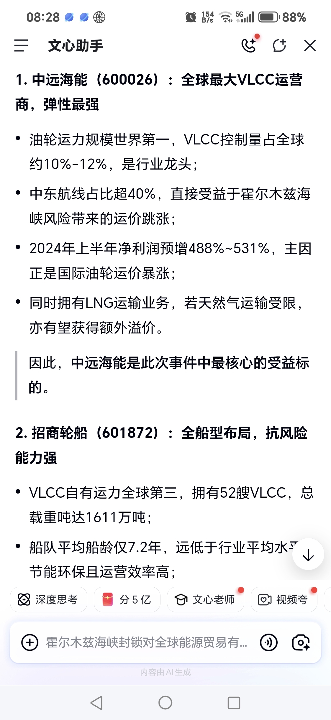 说霍尔木兹海峡封锁对航运股油气中远海能是重大利空,开盘跌停的,有脑子吗
