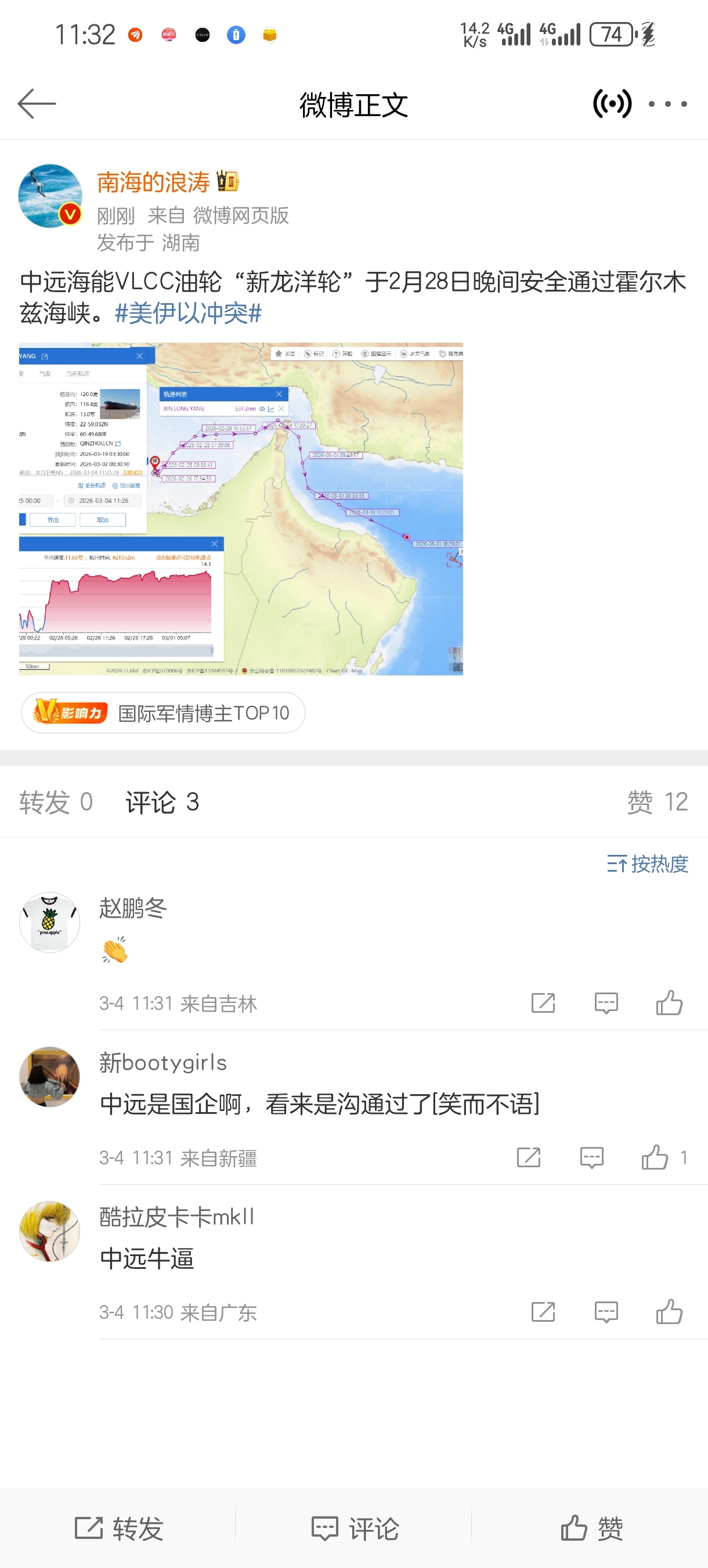 $中远海能(SH600026)$ 中远海能VLCC油轮"新龙洋轮"于2月28日晚间安全通过霍尔木兹海峡。#美伊以冲突#