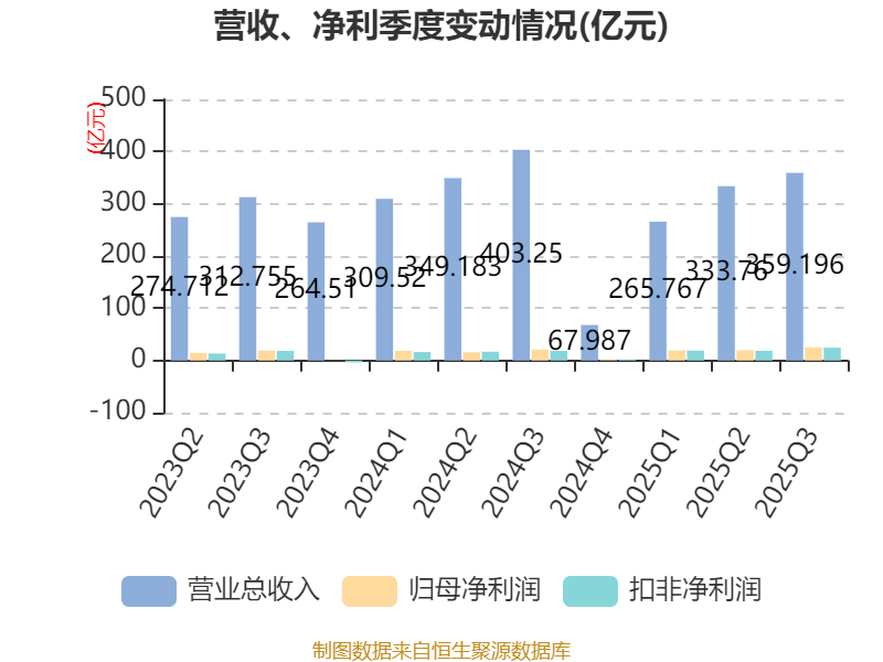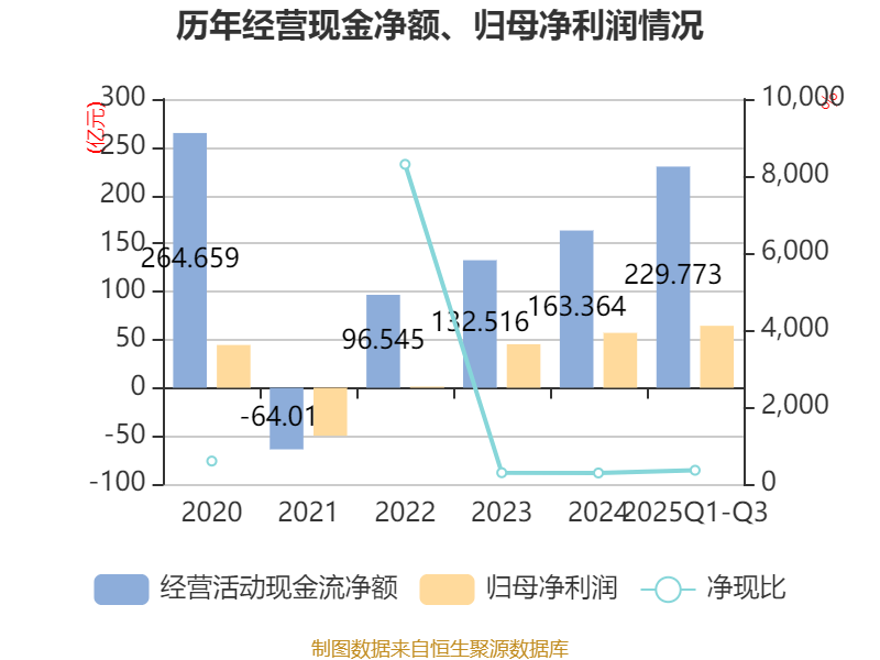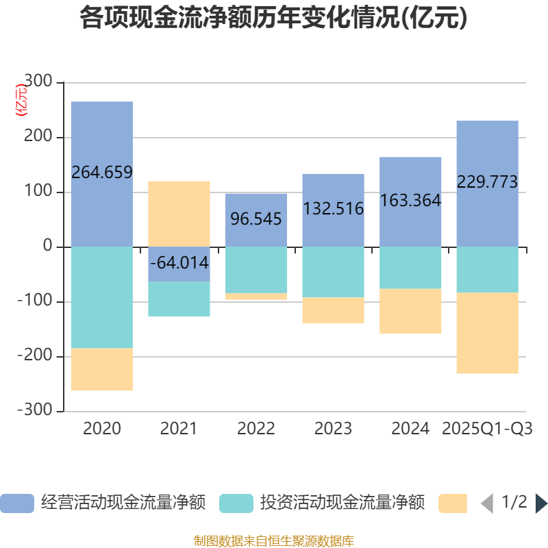 2025年前三季度,公司经营活动现金流净额为229.77亿元,同比增长51.52%;筹资活动现金流净额-147.53亿元,同比减少69.68亿元;投资活动现金流净额-84.11亿元,上年同期为-62.06亿元。