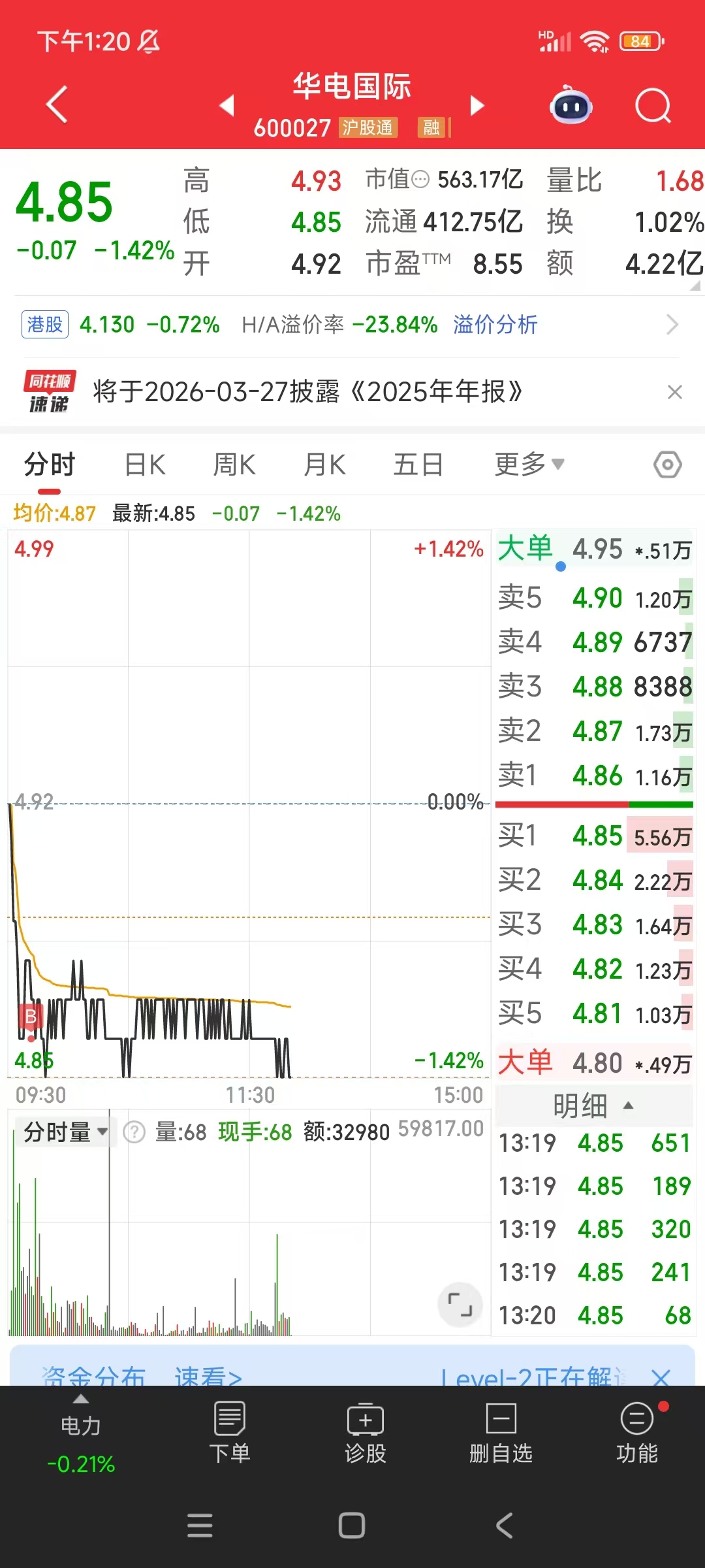$华电国际(SH600027)$ 昨天尾盘竞价买了1/4仓,4.86又加了1/4仓,成本4.89,哎,抄底太急,只能等4.78再加仓了