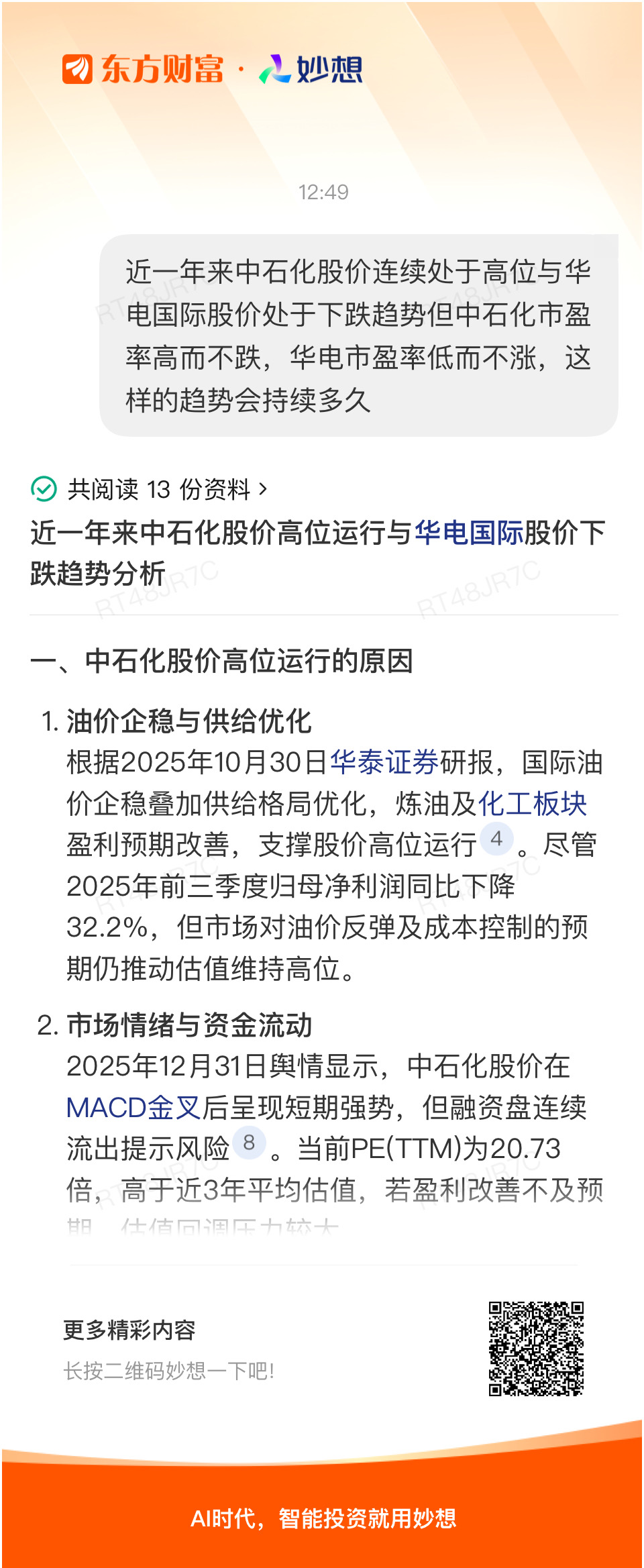#@妙想,你怎么看?# 妙想一下:近一年来中石化股价连续处于高位与华电国际股价处于下跌趋势但中石化市盈率高而不跌,华电市盈率低而不涨,这样的趋势会持续多久