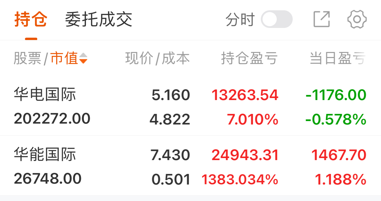 $华电国际(SH600027)$ $华能国际(SH600011)$ 昨天和今天上午高位逐步清仓了华能国际,华电也减仓了一小点。今天下午忙完发现跳水了,又低位7.39买进了3500股华能,总仓位3层仓,分享一下持仓情况。明天这两兄弟会怎么走,大家说点靠谱的看法吧