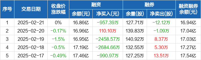 中国石化:融资净偿还957.39万元,融资余额16.86亿元(02-21)